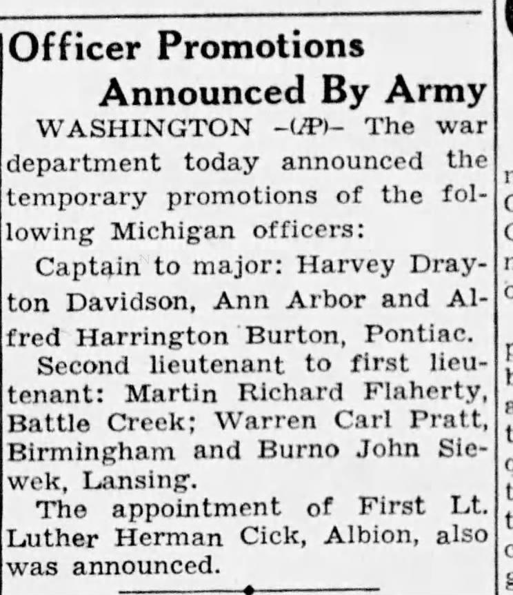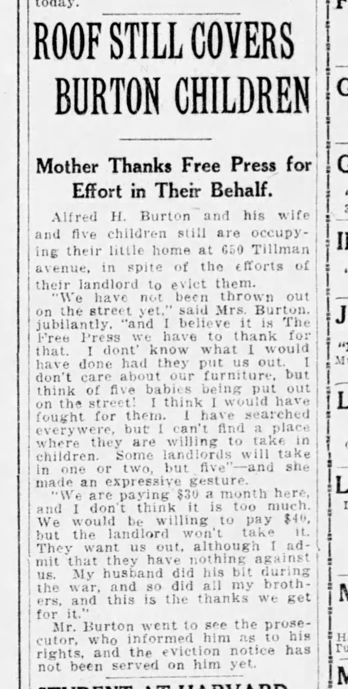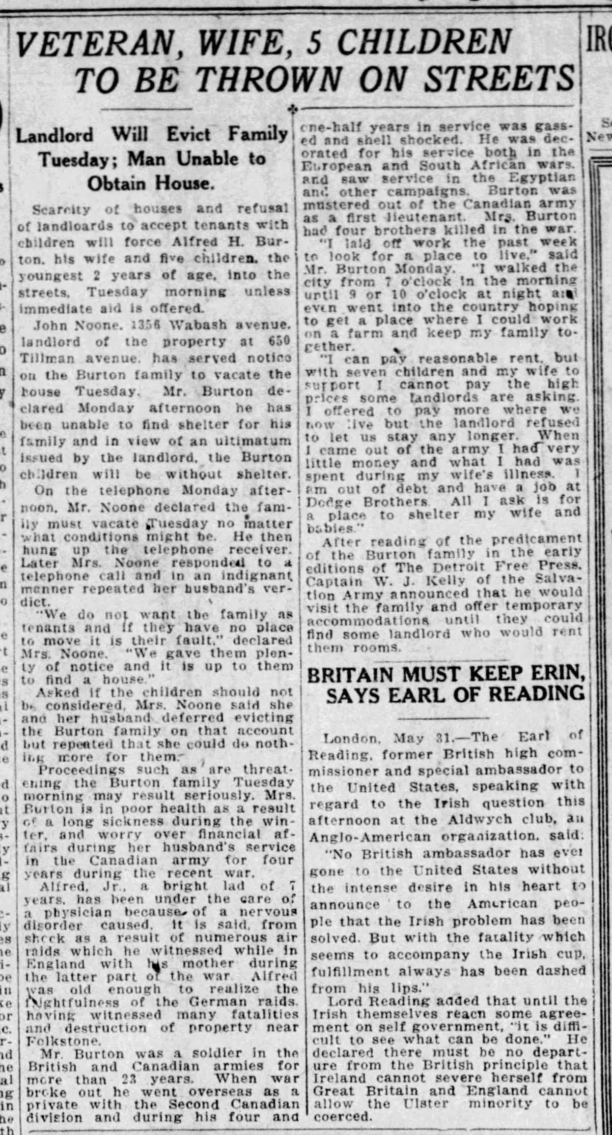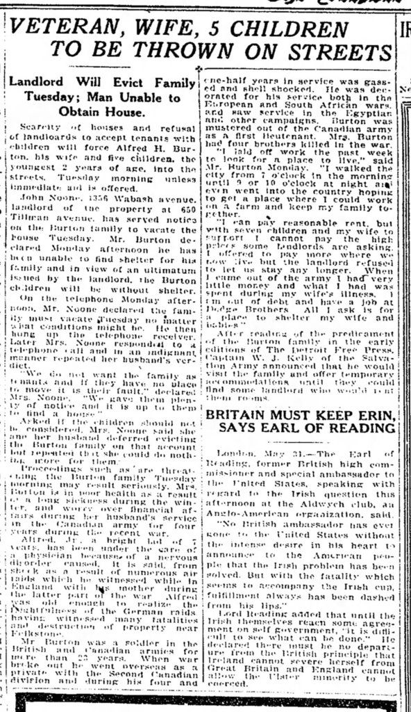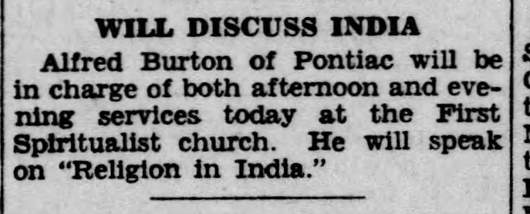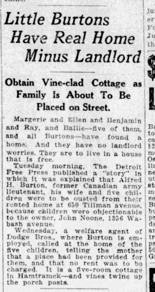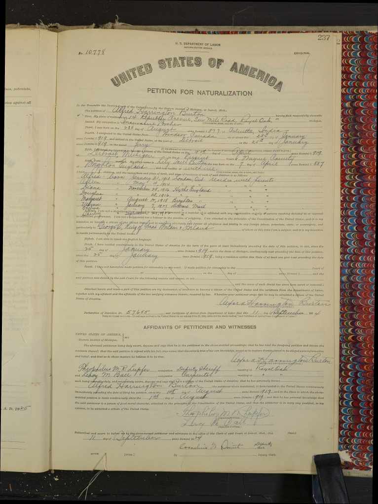 Family Search: Alfred Harrington Burton was born on 23 August 1877, in Calcutta, West Bengal, India as the son of Alfred Burton and Alice Maud Tucker. He married Lily Faith Townsend on 15 June 1912, in Middlesex, Ontario, Canada. They were the parents of at least 2 sons and 7 daughters. He immigrated to United States in 1919 and lived in Detroit Ward 12, Detroit, Wayne, Michigan, United States in 1920 and Warren Township, Macomb, Michigan, United States in 1930. He registered for military service in 1914. In 1924, at the age of 47, his occupation is listed as insurance broker in Royal Oak, Oakland, Michigan, United States.