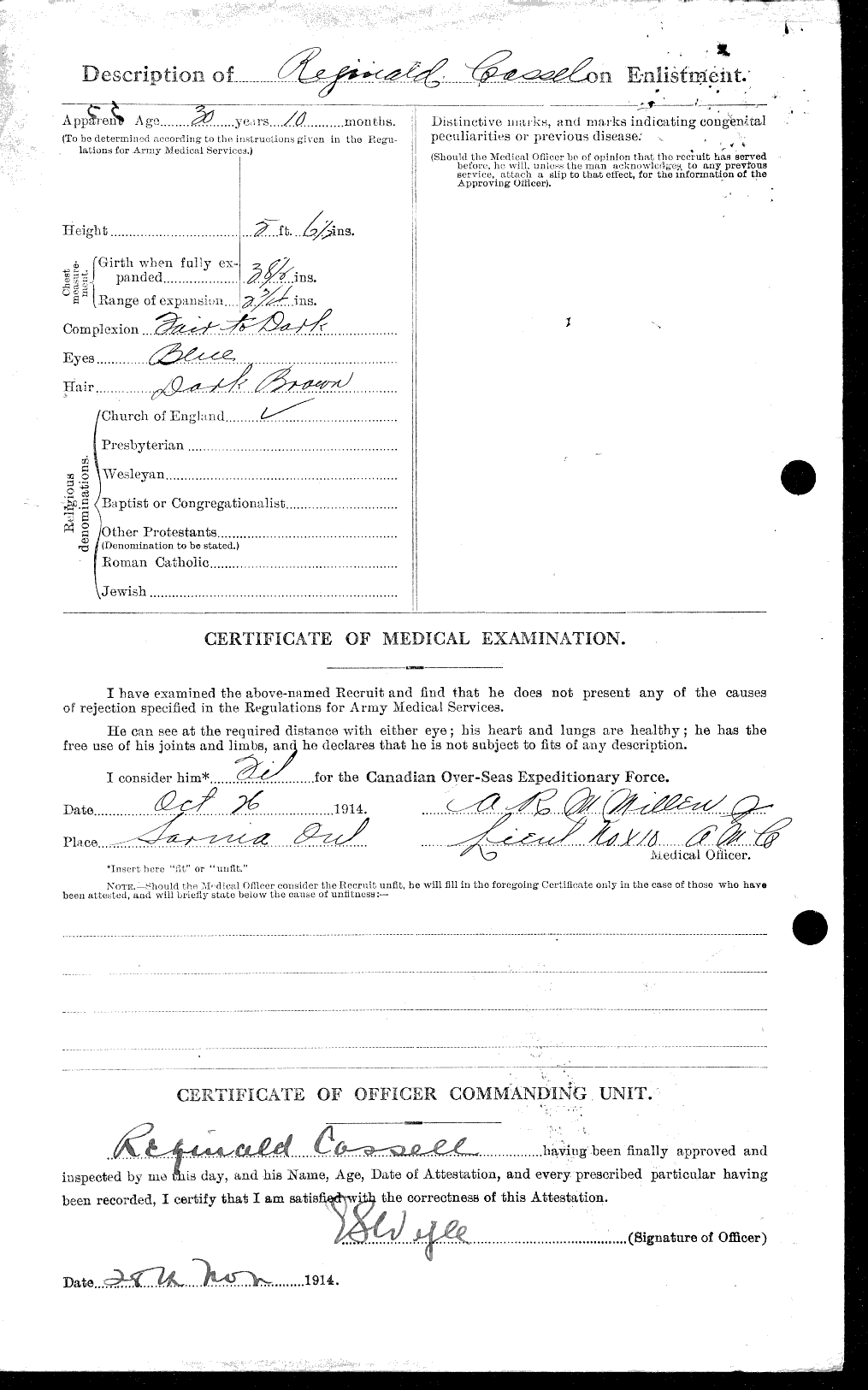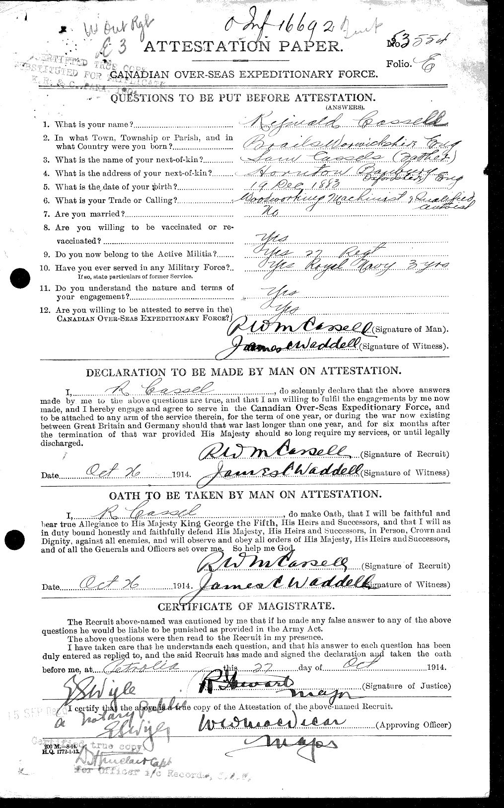 Family Search: When Private Reginald William Miles Cassell was born on 19 December 1883, in Brailes, Warwickshire, England, United Kingdom, his father, Sam Miles Castle or Cassell, was 22 and his mother, Martha Painter, was 29. He married Dorothy Kate Kingston in 1930, in Banbury, Oxfordshire, England, United Kingdom. They were the parents of at least 1 son. He immigrated to Canada in 1914 and lived in Hornton, Oxfordshire, England, United Kingdom in 1911. He registered for military service in 1914. In 1914, at the age of 31, his occupation is listed as woodworking machinst & tree arborist. He died in 1966, in Gosport, Hampshire, England, United Kingdom, at the age of 83.