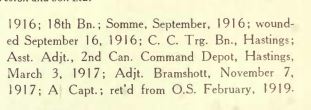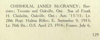 CHISHOLM, JAMES McCRANEY; Barrister; Toronto and Oakville, Ont. Some of Frank H. Chisholm, Oakville, Ont.; Arts ’13-’15; Lt. 20th Regt. Halton Rifles; E. September 9, 1915, Lt. 76th Bn.; O.S. April 23, 1916; France, July 6, 1916. 18th Bn.; Somme, September, 1916. wounded September 16, 1916; C.C. Trg. Bn., Hastings; Asst. Adjt., 2nd Can. Command Depot, Hastings, March 3, 1917; Adjt. Bramshott, November 7, 1917; A Capt.; ret’d from O.S. February, 1919.