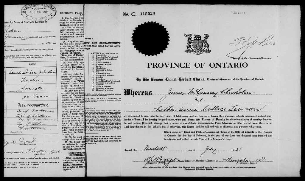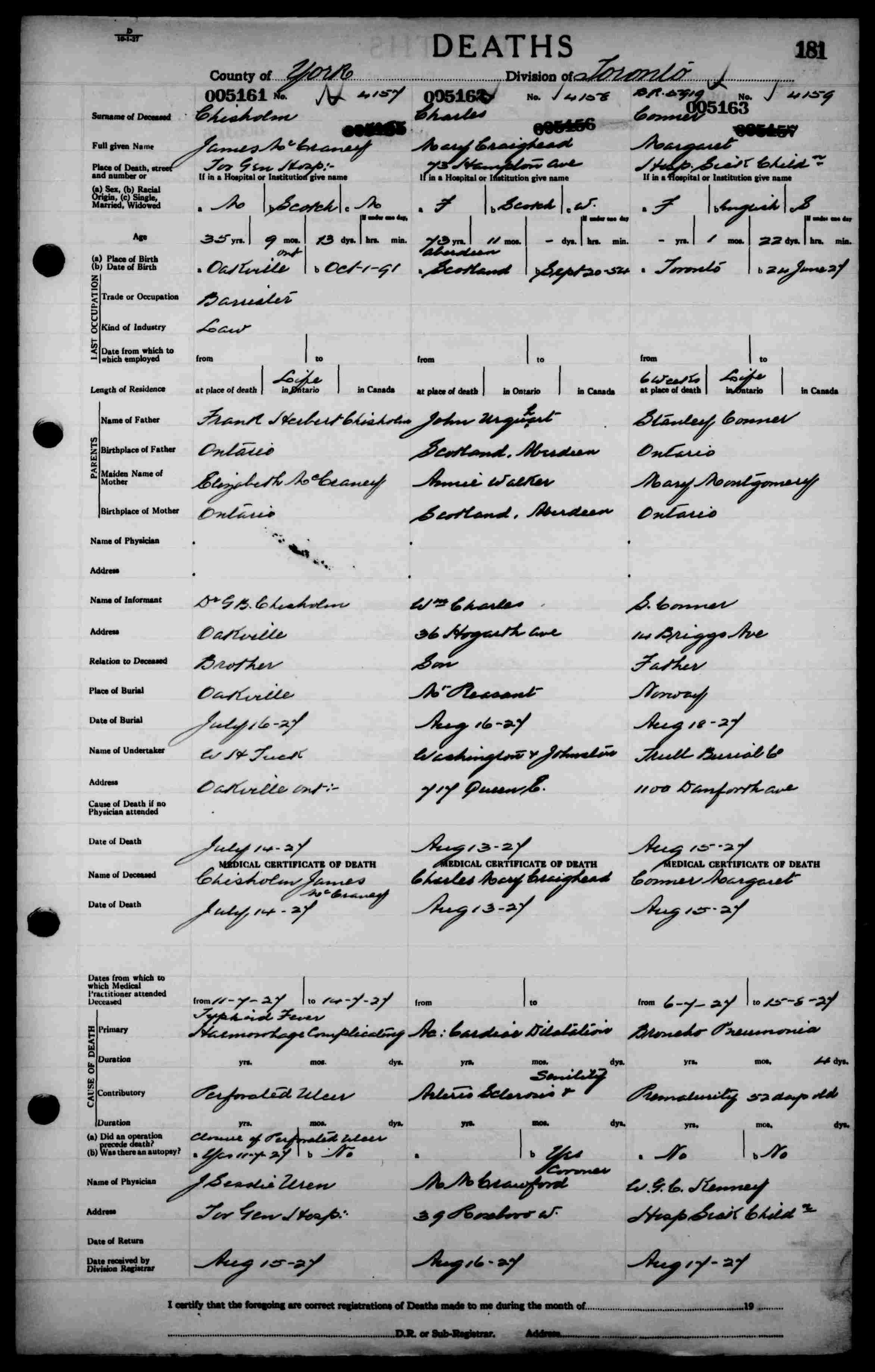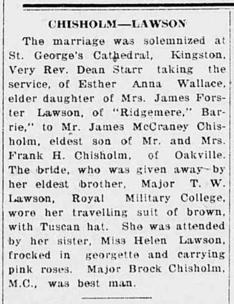 Family Search: When James McCraney Chisholm was born on 1 October 1892, in Ontario, Canada, his father, Frank Herbert Chisholm, was 29 and his mother, Lizzie Annette McCraney, was 26. He married Esther Anna Wallace Lawson on 25 July 1921, in Kingston, Frontenac, Ontario, Canada. He died on 14 July 1927, in Toronto, York, Ontario, Canada, at the age of 34, and was buried in Oakville, Halton, Ontario, Canada.