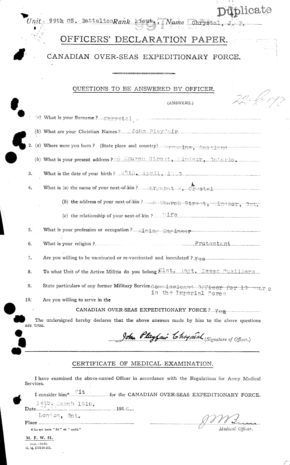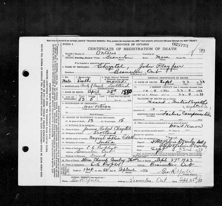 Chrystal, John Playfair: Lieutenant Digitized Service Record Source: War Diary May 6, 1917. Find-A-Grave London Gazette. October 23, 1908. Page 7649. Via Find-A-Grave. Contributed by Mike Crosby. Share this: Click to email a link to a friend (Opens in new window) Email Click to share on Facebook (Opens in new window) Facebook Click to share on X (Opens in new window) X Click to share on Reddit (Opens in new window) Reddit Click to share on LinkedIn (Opens in new window) LinkedIn Click to print (Opens in new window) Print Click to share on Tumblr (Opens in new window) Tumblr Click to share on Pocket (Opens in new window) Pocket Click to share on Pinterest (Opens in new window) Pinterest Click to share on Telegram (Opens in new window) Telegram Click to share on WhatsApp (Opens in new window) WhatsApp Like Loading... Leave a comment Cancel reply Δ This site uses Akismet to reduce spam. Learn how your comment data is processed.