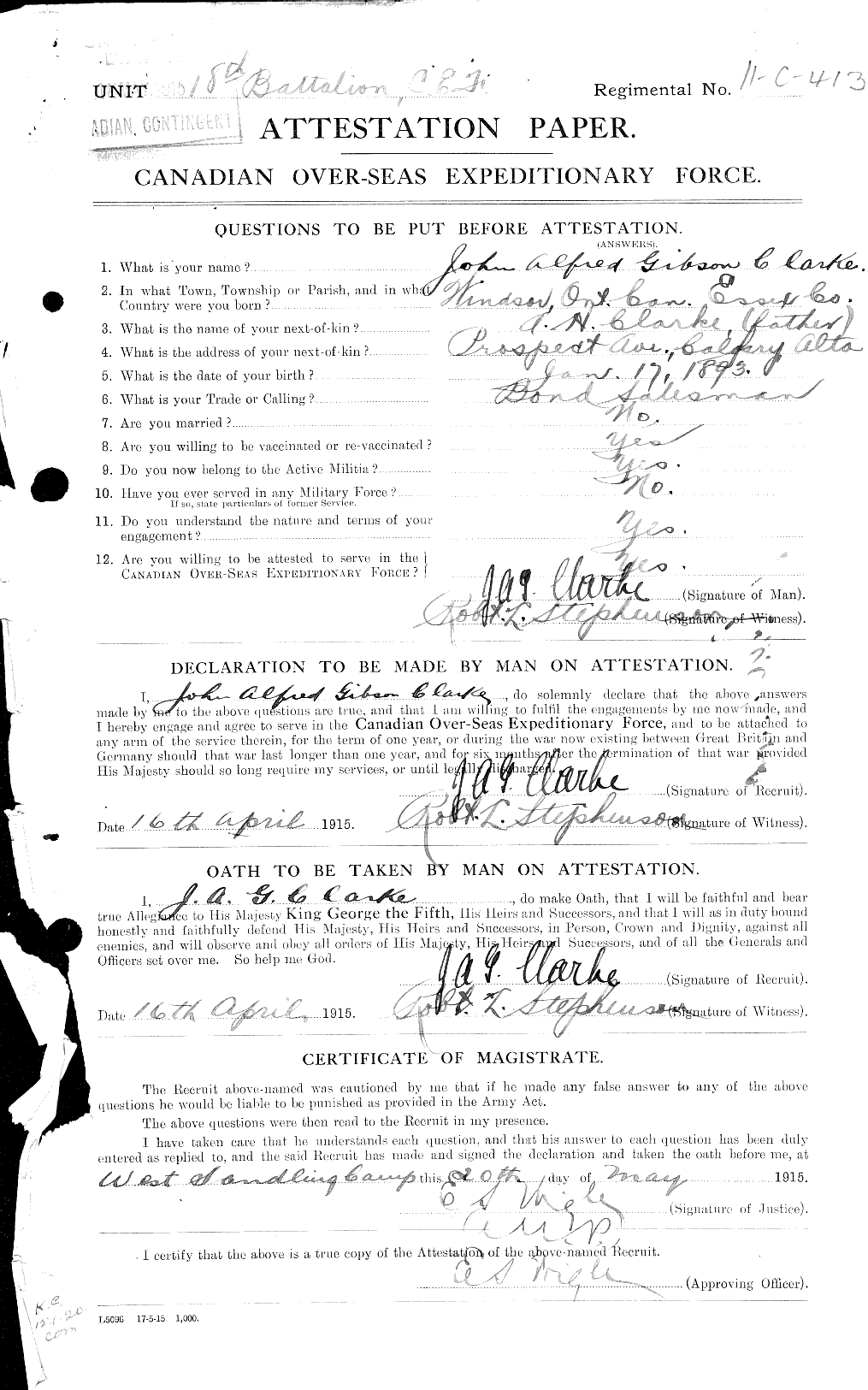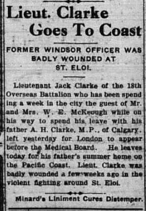 CLARKE, JOHN ALFRED GIBSON: c/o Messrs. Wood, Gundy & Co., Toronto; B. ; E. September ’06 from Windsor P.S.; aged 13-6; L. June ’09; Re-E. January ’10; L. June ’11; son of A.H. Clarke, Windsor, Ont.; Studt. Univ. Tor. for one year. Enlisted, January 2, 1915; C.E.F.; 33rd Bn., C.E.F., Lt.; transf’d 18th Bn., C.E.F. O.S., Aprile 1915; France, seven months; wounded (severly0, April, 1916; mentioned for reconnaissance work, April, 1916; M.C.; Capt. May, 1917.
