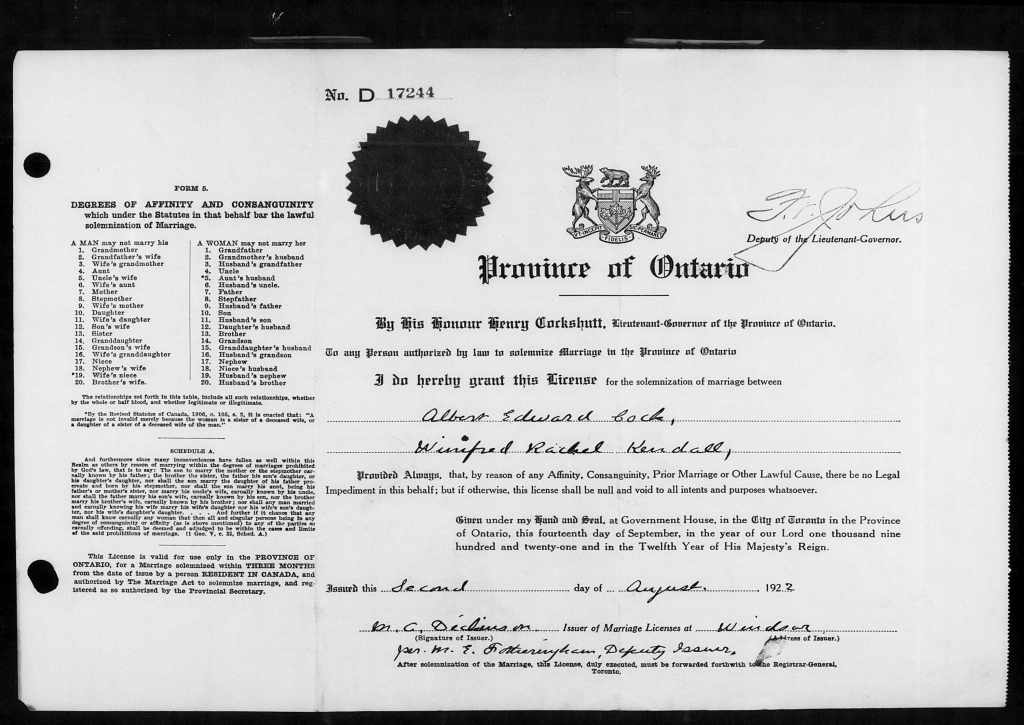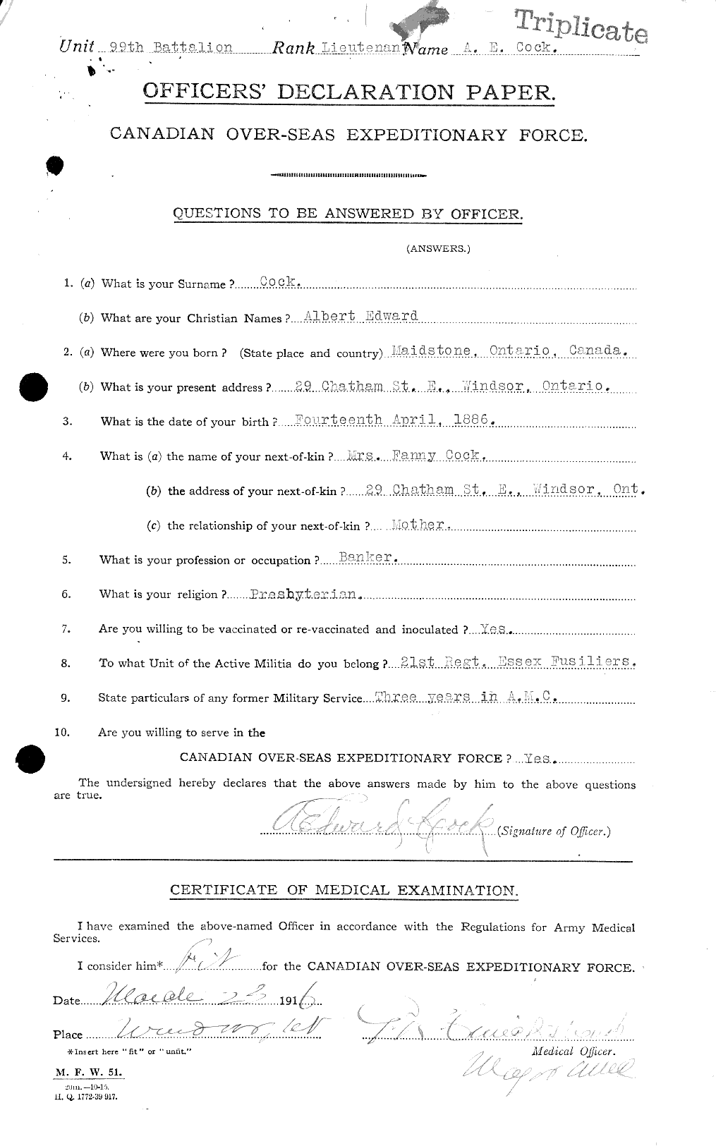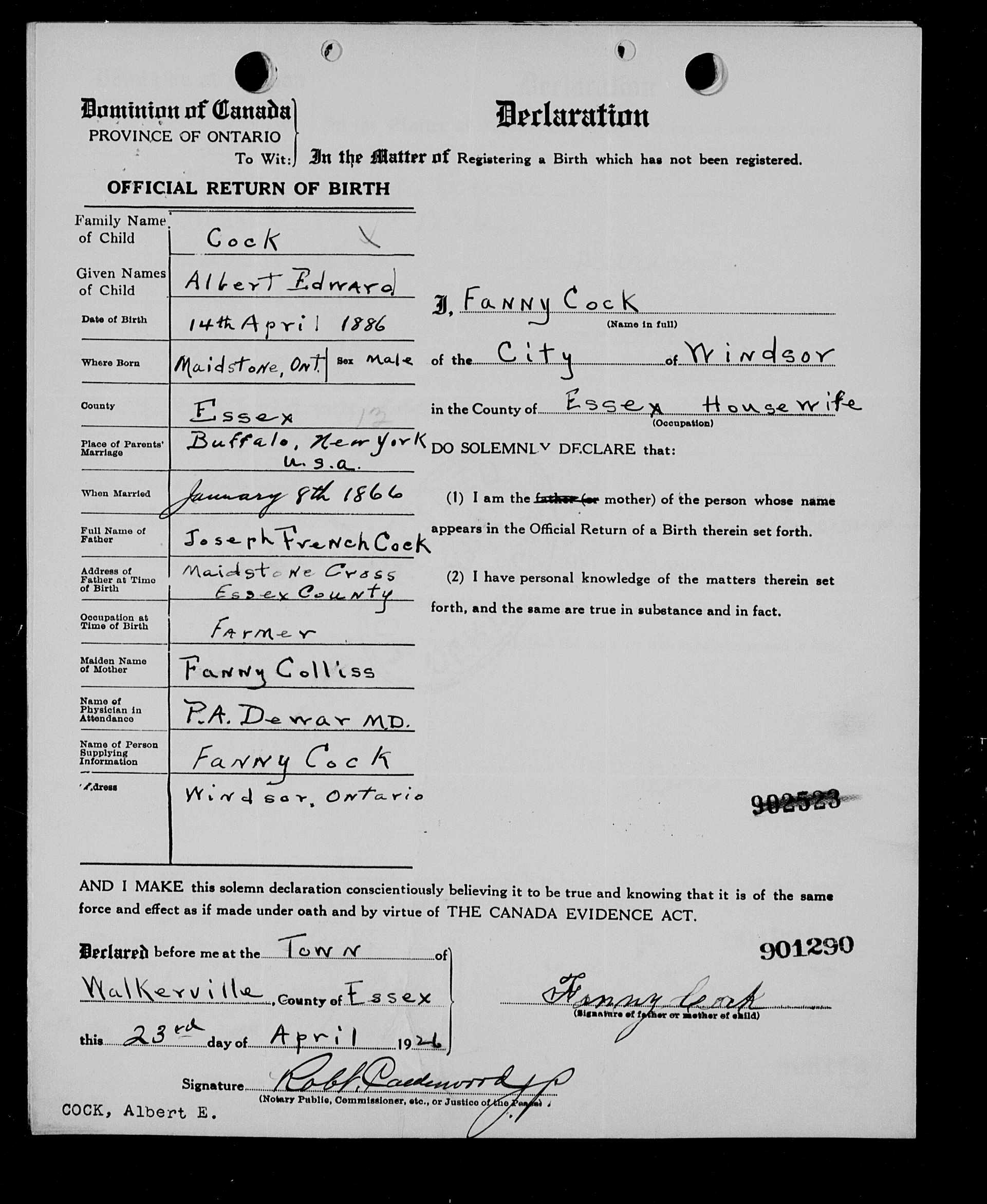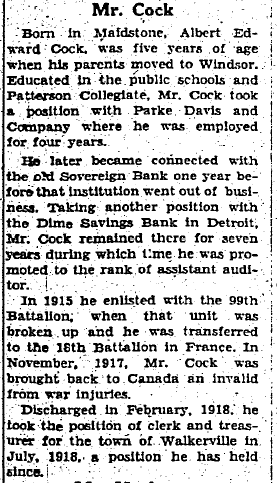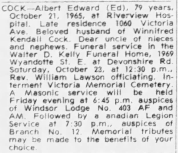 Family Search: When Lieutenant Albert Edward Cock was born on 14 April 1886, in Maidstone, Tecumseh, Essex, Ontario, Canada, his father, Joseph French Cock, was 42 and his mother, Frances Colliss, was 42. He married Winnifrid Kendall on 16 August 1922, in London Township, Middlesex, Ontario, Canada. He lived in Essex, Ontario, Canada for about 10 years. He registered for military service in 1916. In 1916, at the age of 30, his occupation is listed as bank clerk in Windsor, Sandwich Township, Essex, Ontario, Canada. He died on 21 October 1965, in Windsor, Essex, Ontario, Canada, at the age of 79, and was buried in Victoria Memorial Gardens, Windsor, Essex, Ontario, Canada.