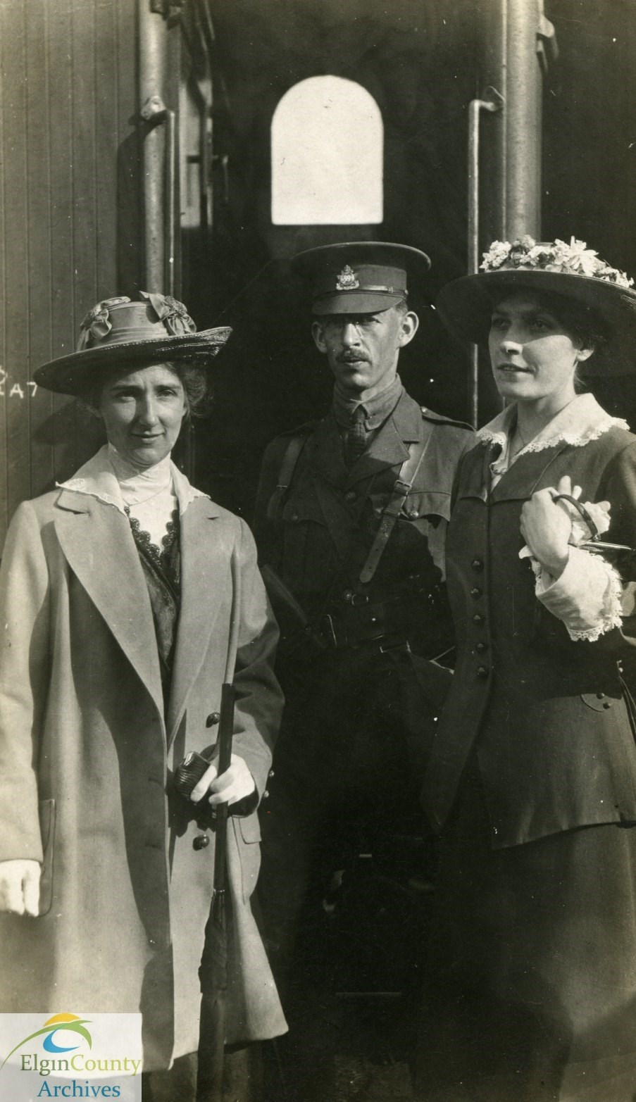 Black and white photograph showing uniformed First World War soldier Ed Cock, posing in the doorway of a railway car, presumably at the time of his deployment for overseas service, possibly as part of the 91st [99th Battalion] Battalion, St. Thomas deployment on June 25, 1916. Cock was Elda Mae Horton Patterson’s uncle. The women shown posing with Cock are identified as Annie Cock, left, Cock‘s sister; and Cock‘s wife Winnie Kendall Cock, right. The only soldier identified in Library and Archives Canada’s database of Canadian Expeditionary Force attestation papers is Lieutenant Albert Edward Cock, 99th Battalion, born April 14, 1886: http://www.bac-lac.gc.ca/eng/discover/military-heritage/first-world-war/first-world-war-1914-1918-cef/Pages/item.aspx?IdNumber=107594. Source: Elgin County Archives