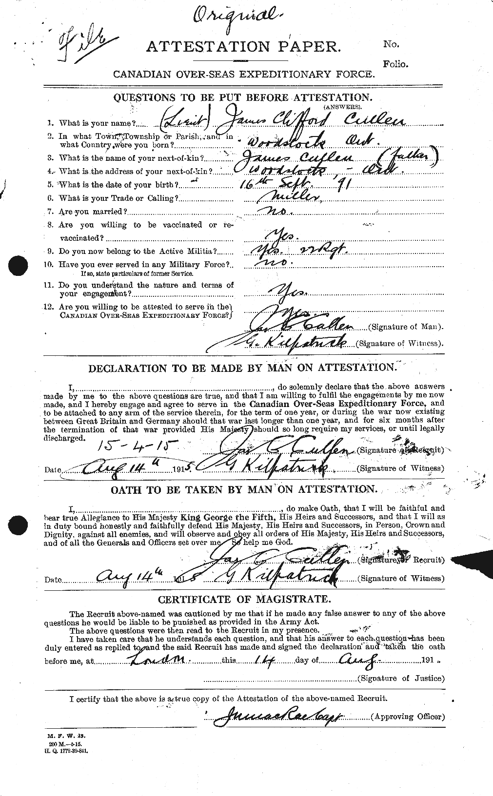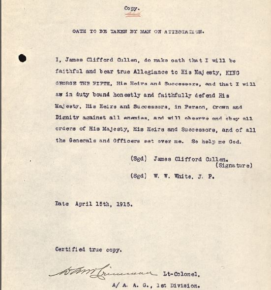 !, James Clifford Cullen, do make oath that I will be faithfully and bear true Allegiance to His Majesty, KING GEORGE THE FIFTH, His Heirs and Successors, and that I will a [act] in duty bound honestly and faithfully defend His Majesty, His Heirs and Successors, in Person, Crown and Dignity against all enemies, and will observe and obey all orders of His Majesty, His Heirs and Successors, and of all Generals and Officers set over me. So help me God.