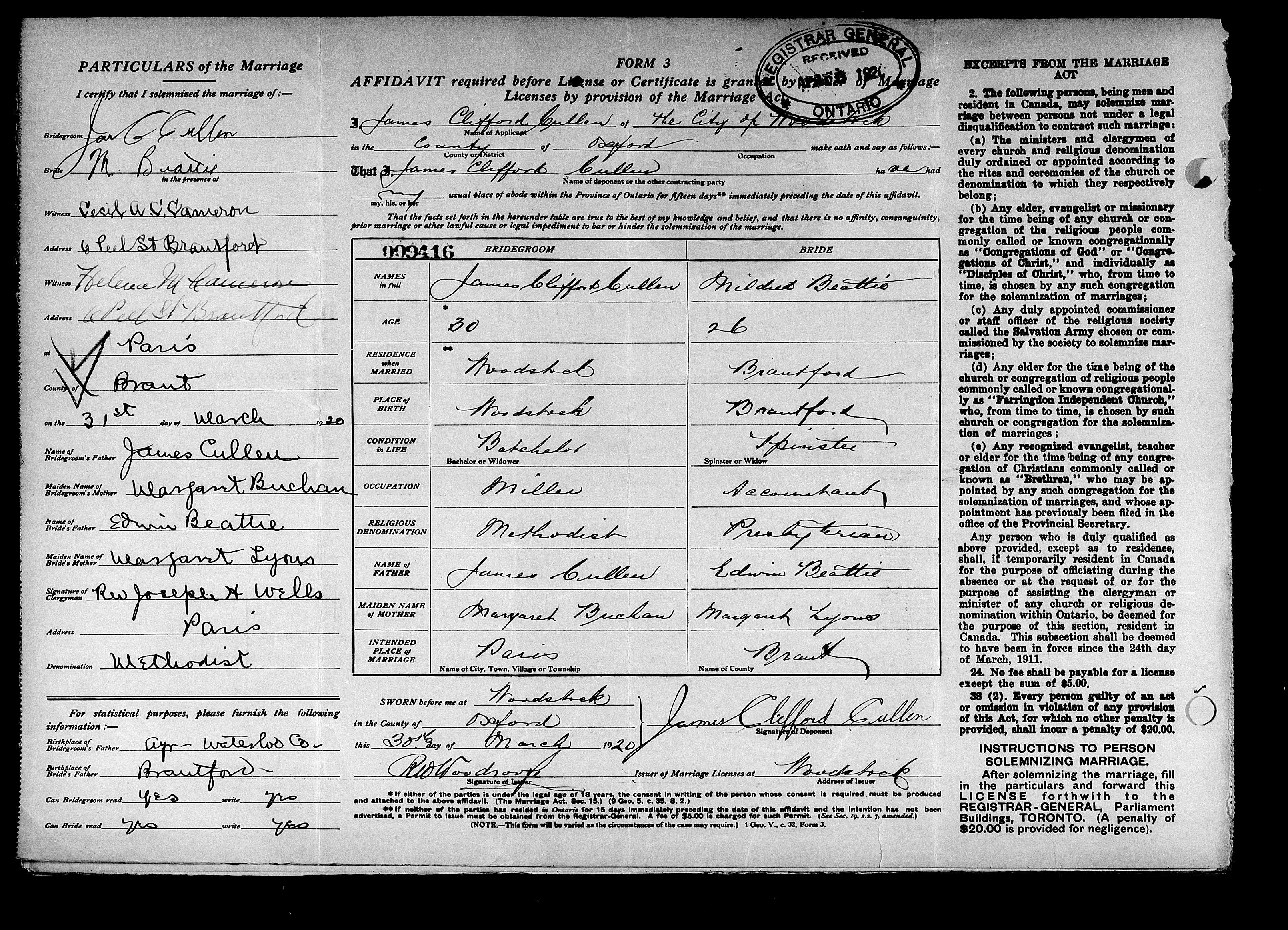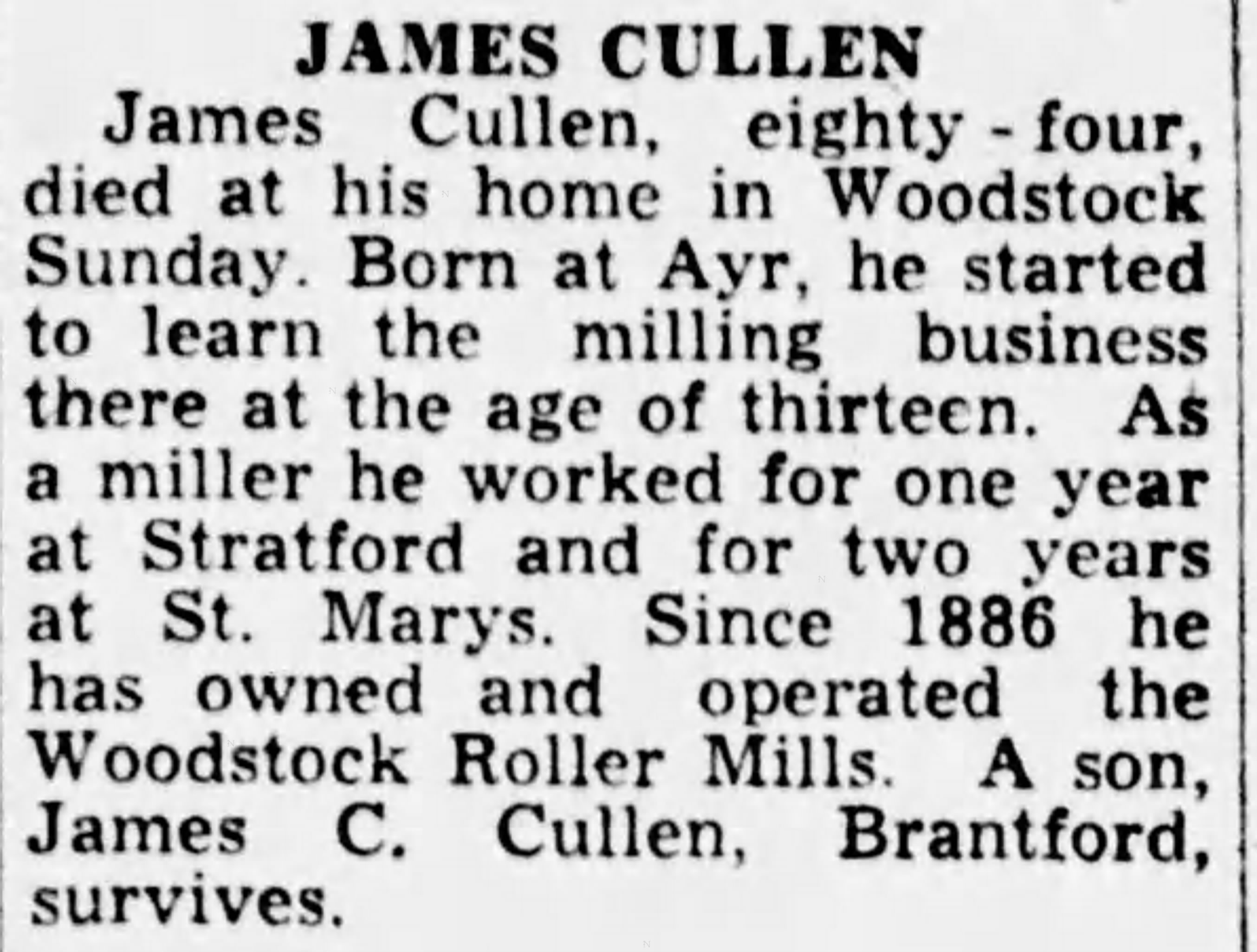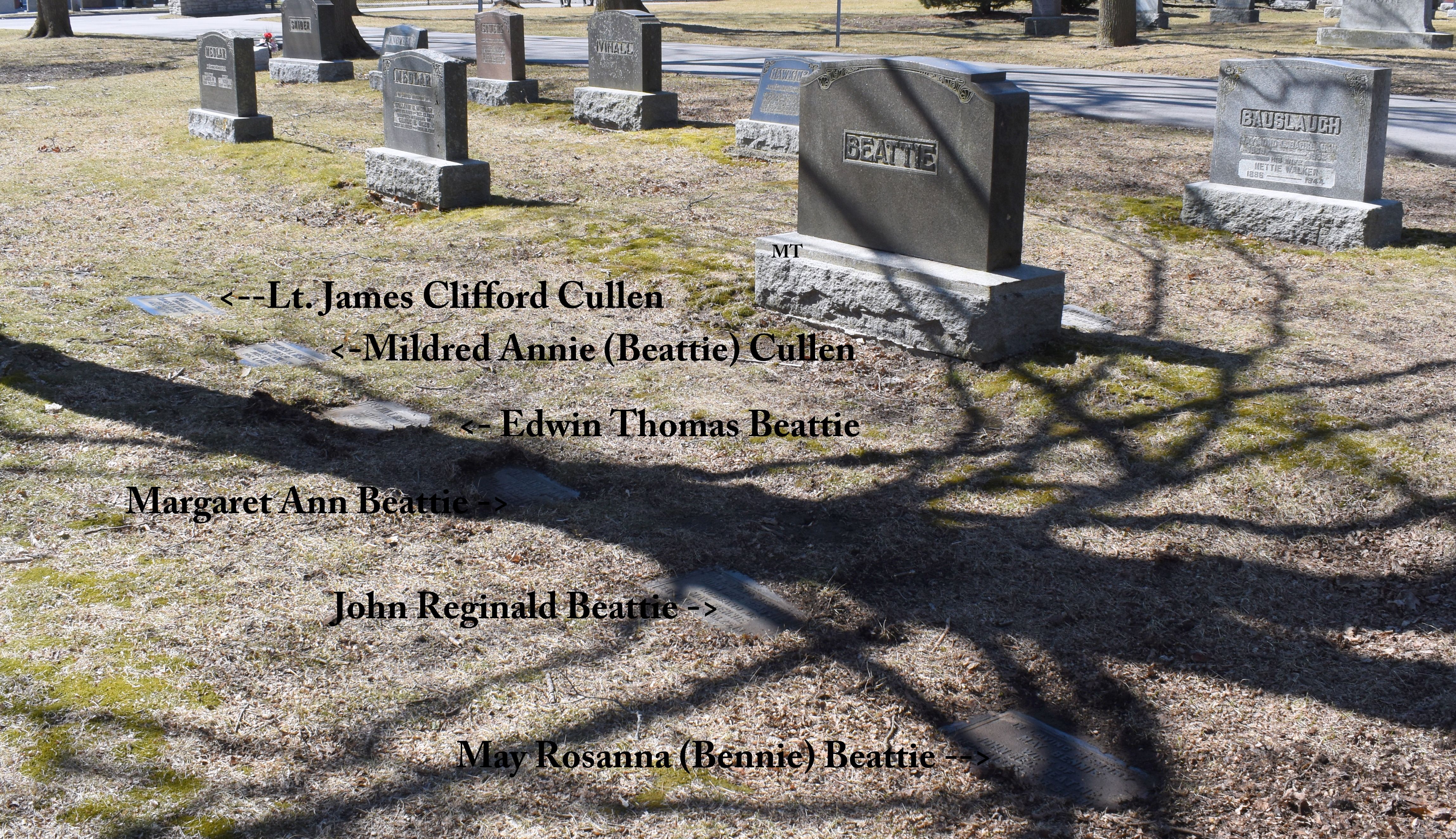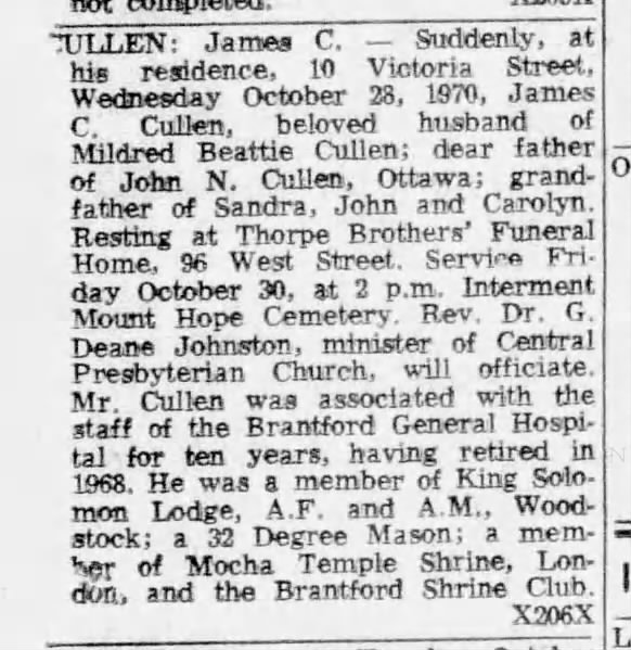 Family Search: When Lieutenant James Clifford Cullen was born on 6 September 1891, in Woodstock, Oxford, Ontario, Canada, his father, James Cullen, was 28 and his mother, Margaret Jessie Buchan, was 28. He married Annie Mildred Beattie on 31 March 1920, in Paris, South Dumfries Township, Brant, Ontario, Canada. They were the parents of at least 1 son. He lived in Oxford, Ontario, Canada, for about 10 years. He died on 28 October 1970, in Brantford, Brant, Ontario, Canada, at the age of 79, and was buried in Mount Hope Cemetery, Brantford, Brant, Ontario, Canada.