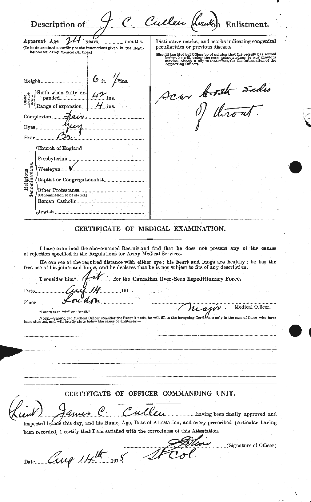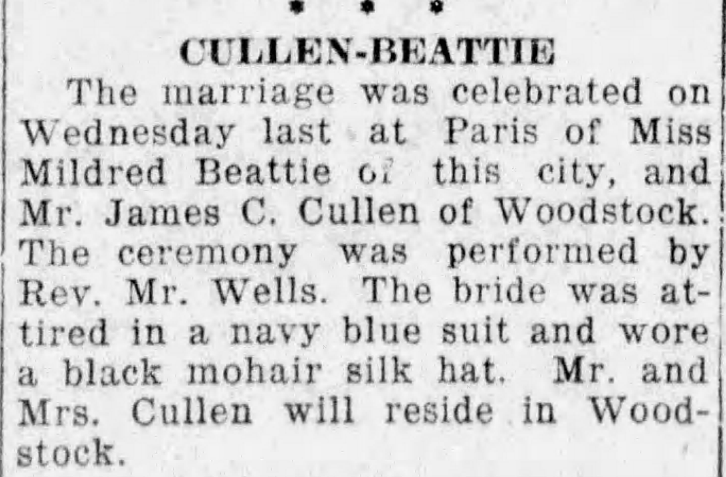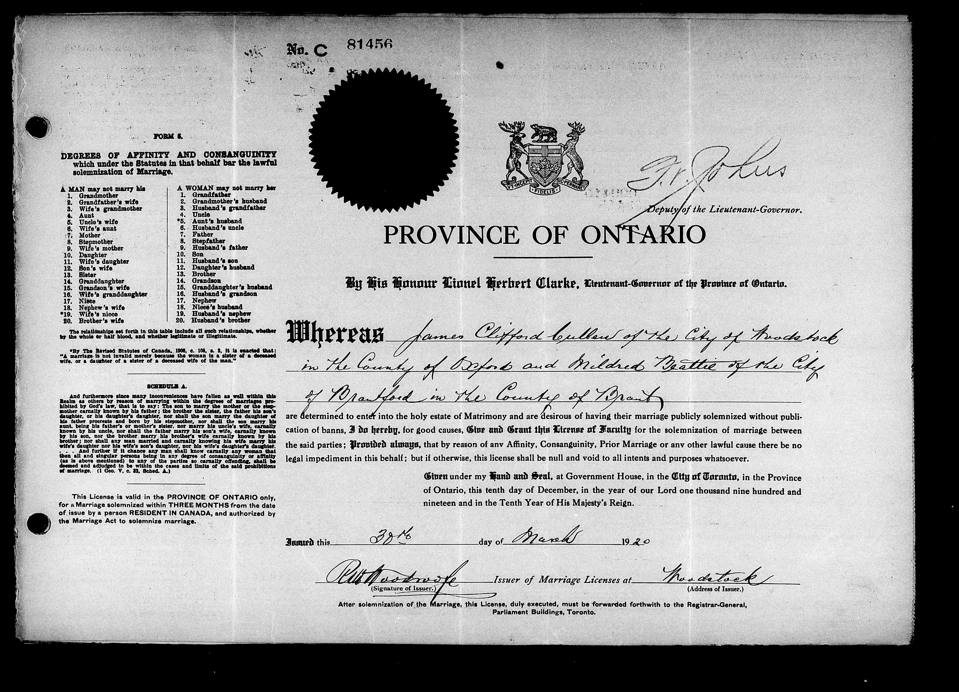 Family Search: When Lieutenant James Clifford Cullen was born on 6 September 1891, in Woodstock, Oxford, Ontario, Canada, his father, James Cullen, was 28 and his mother, Margaret Jessie Buchan, was 28. He married Annie Mildred Beattie on 31 March 1920, in Paris, South Dumfries Township, Brant, Ontario, Canada. They were the parents of at least 1 son. He lived in Oxford, Ontario, Canada, for about 10 years. He died on 28 October 1970, in Brantford, Brant, Ontario, Canada, at the age of 79, and was buried in Mount Hope Cemetery, Brantford, Brant, Ontario, Canada.