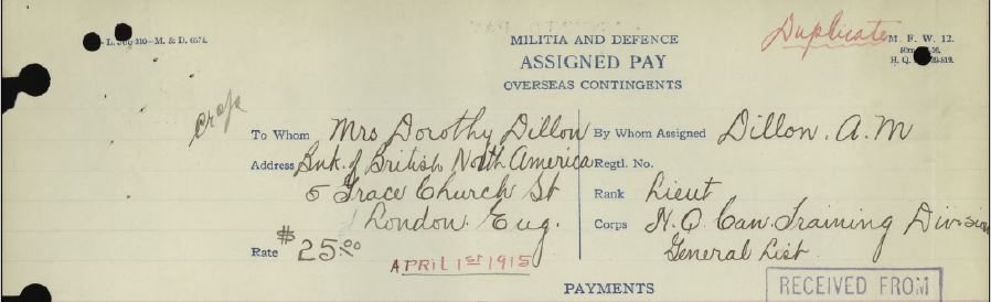 London Free Press: Through a cablegram to his parents in this city, it was learned yesterday that Lieut. Arnold M. Dillon, of the 18th Battalion, had been wounded, though to what extent is not known. Lieut. Dillon, who was formerly of the 7th Regiment, is a son of Mrs. John H. Dillon, of the A.M. Smith company firm. At present he and Mrs. Dillon are in Florida. Lieut. Dillon was married, after being appointed to the 18th to Miss Allen, daughter of W.C. Allen, of this city. The young officer’s wife is now in Stratford, Eng. The casualty list last night did not include Lieut. Dillon’s name.