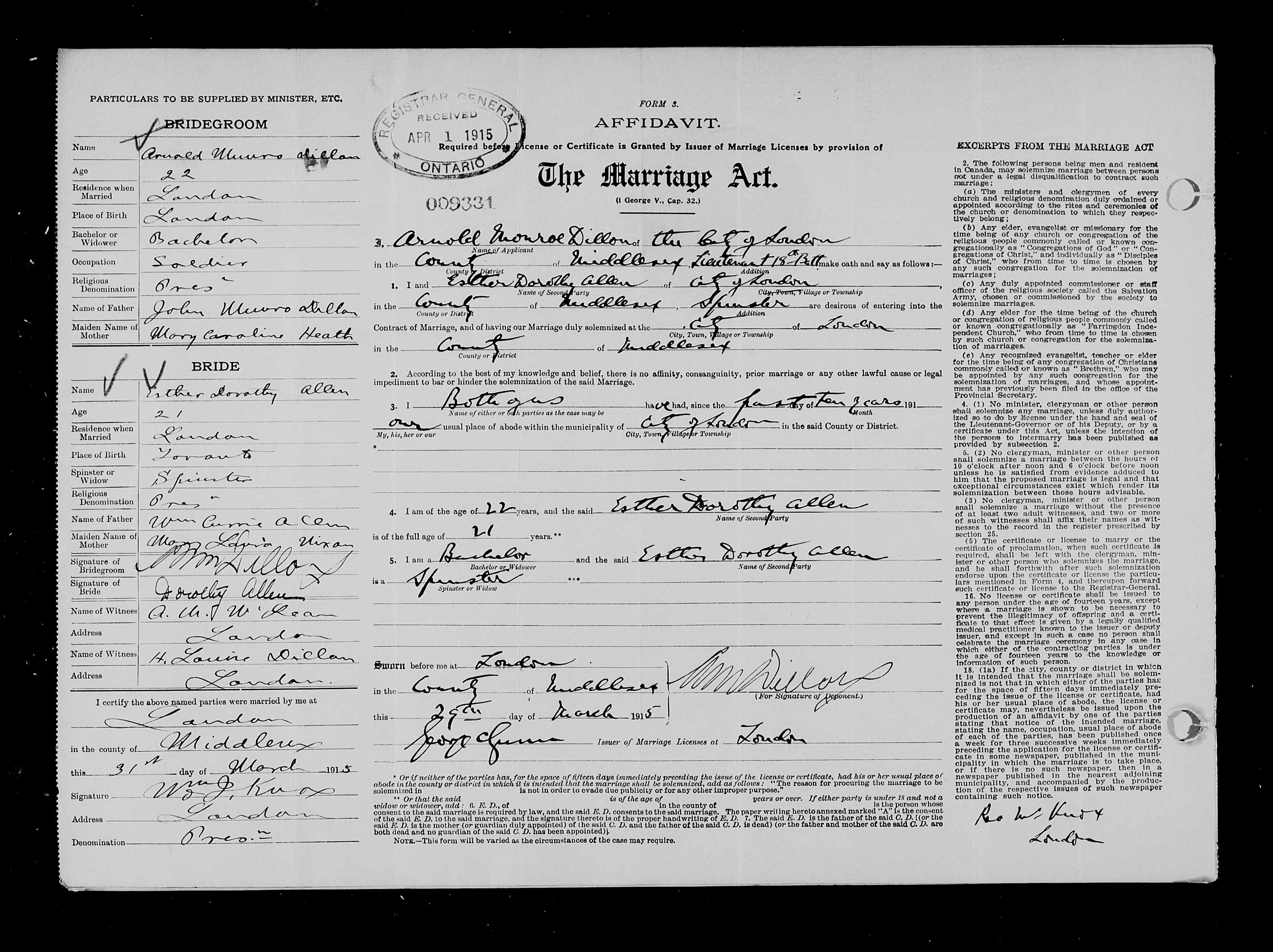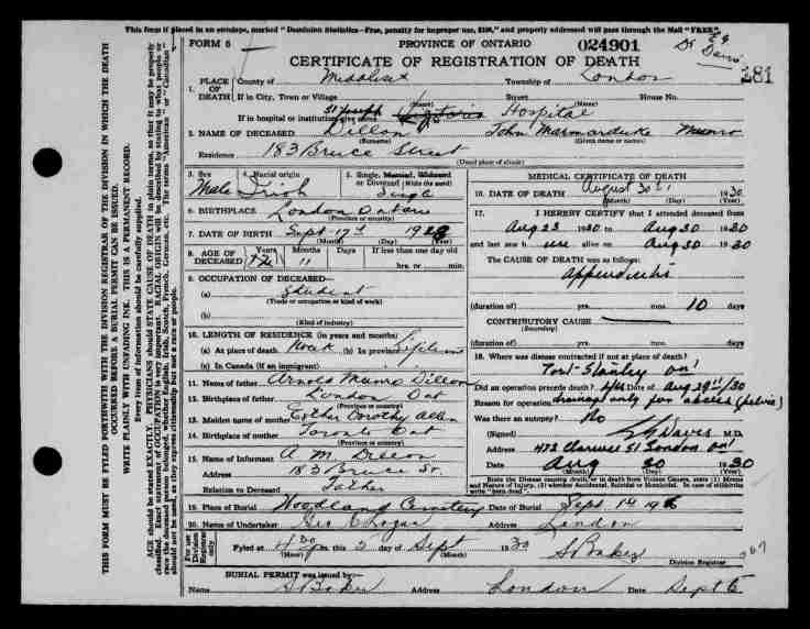 Family Search: When Captain Arnold Munroe Dillon was born on 26 August 1892, in London, Ontario, Canada West, British Colonial America, his father, John Munroe Dillon, was 37 and his mother, Mary Caroline Heath, was 35. He married Esther Dorothy Allen on 31 March 1915, in London Township, Middlesex, Ontario, Canada. They were the parents of at least 1 son. He lived in Middlesex, Ontario, Canada in 1901. He died on 13 May 1955, in London, Ontario, Canada, at the age of 62, and was buried in St. Peter’s Cemetery, London, Ontario, Canada.