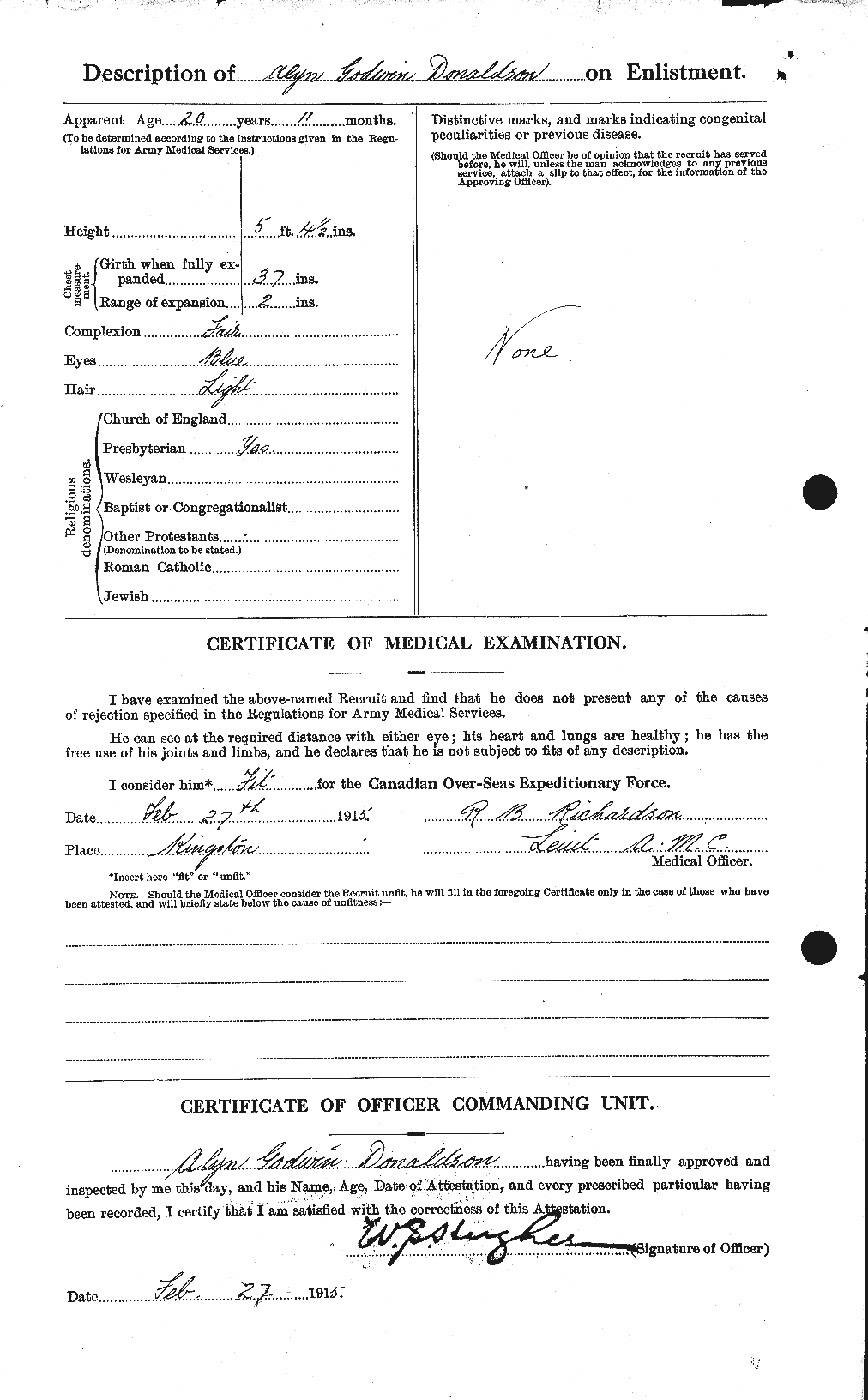 Family Search: When Lieutenant Alyn Godwin Donaldson was born on 30 March 1894, in Brockville, Leeds and Grenville, Ontario, Canada, his father, Allan Scott Donaldson, was 33 and his mother, Francis Louise Godwin, was 30. He married Elaine Sieber on 9 January 1939, in Cook, Illinois, United States. He registered for military service in 1915. In 1915, at the age of 21, his occupation is listed as brakeman. He died on 26 March 1967, in Brockville, Leeds and Grenville, Ontario, Canada, at the age of 72, and was buried in Oakland Cemetery, Brockville, Leeds and Grenville, Ontario, Canada.
