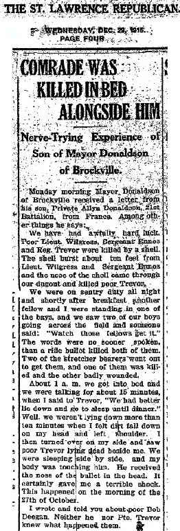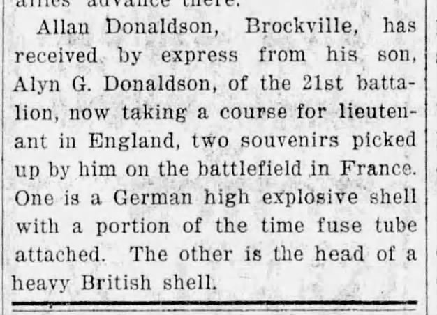 Monday morning Mayor Donaldson of Brockville received a letter from his son, Private Allyn Donaldson, 21st Battalion, from France. Among other things he says: