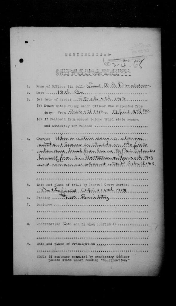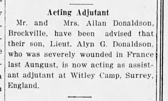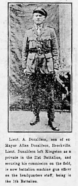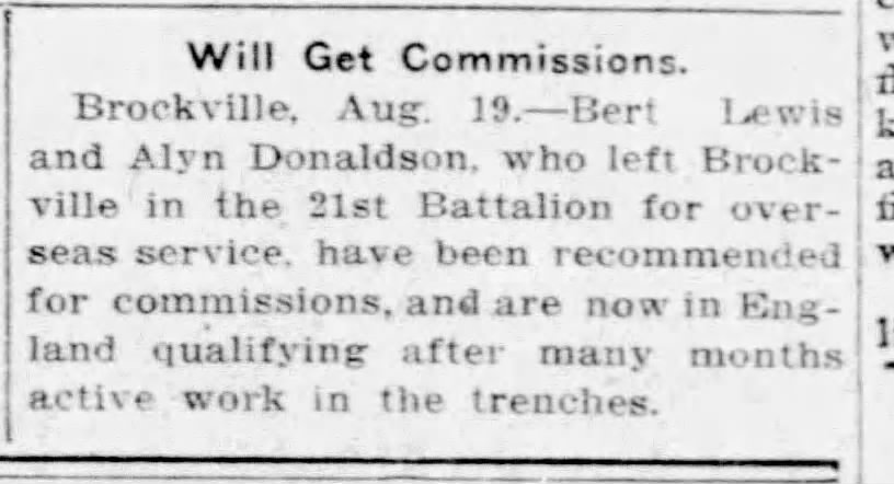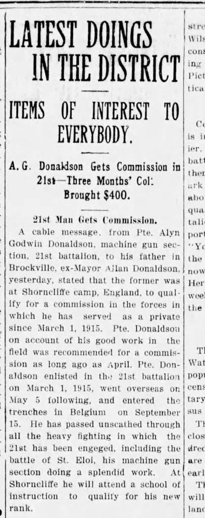 A cable message from Pte. Alyn Godwin Donaldson, machine gun section, 21st Battalion, to his father, ex-mayor Allan Donaldson, yesterday stated that the former was at Shorncliffe Camp, England, to qualify for a commission in the forces in which he has served as a private since March 1, 1915. Pte. Donaldson on account of his good work in the field was recommended for a commission as long ago as April. he is the second Brockville man on the 21st to recently receive a commission. Pte. Bert Lewis having been similarly honoured for his proficiency in the firing line. The cable-gram from Pte. Donaldson simply stated “Here for Commission.”