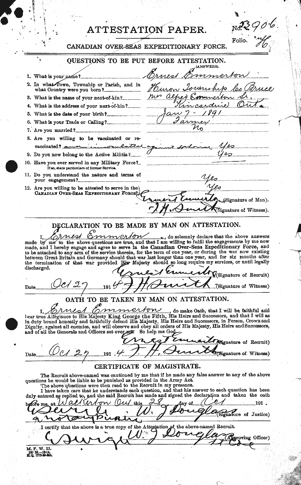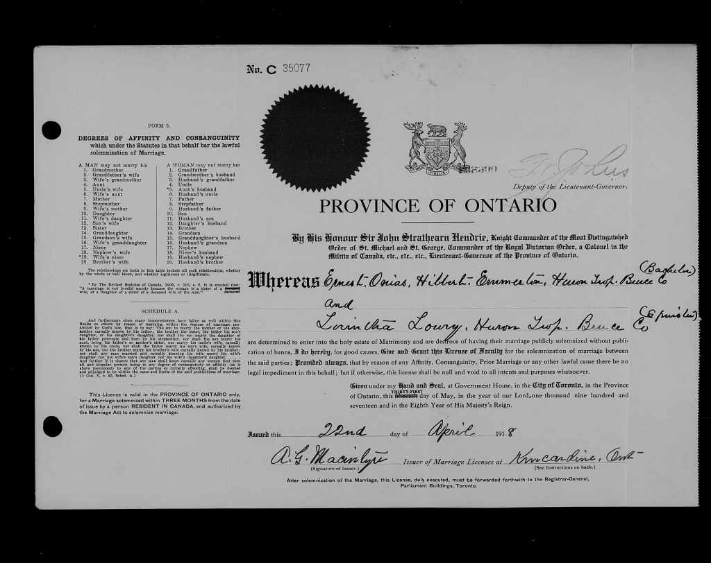 006802/1918 Ernest Onias Hibbert EMMERTON, 27, farmer, Huron Twp, same, s/o Alfred EMMERTON & Charlotte HIBBERT, married Lorintha LOWRY, 26, farmers dau, Huron Twp, same, d/o Robert LOWRY & Elizabeth ORR, witn: I. Della LOWRY, of Ripley & Charles E WORTHY of Kincardine, 4 Apr 1918 Methodist Parsonage, Bruce Co. [probably Ripley]