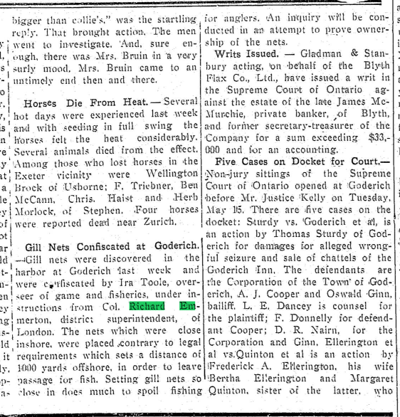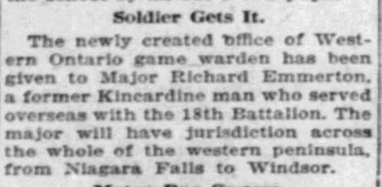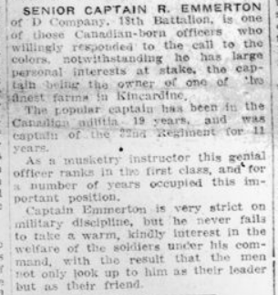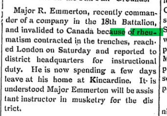 Major R. Emmerton, recently commander of a company in the 18th Battalion, and invalided to Canada because of rheumatism contracted in the trenches, reached London in Saturday and reported to district headquarters for instructional duty. He is now spending a few days leave at his home in Kincardine. It is understood Major Emmerton will be assistant instructor in musketry for the district.
