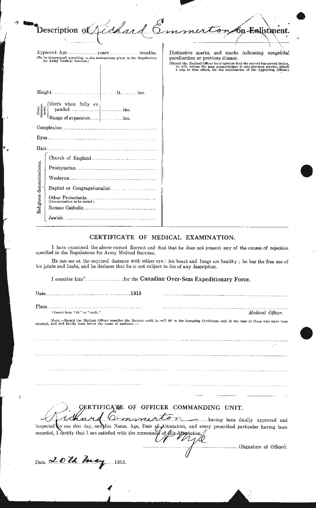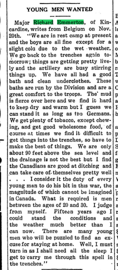 Major R. Emmerton, recently commander of a company in the 18th Battalion, and invalided to Canada because of rheumatism contracted in the trenches, reached London in Saturday and reported to district headquarters for instructional duty. He is now spending a few days leave at his home in Kincardine. It is understood Major Emmerton will be assistant instructor in musketry for the district.