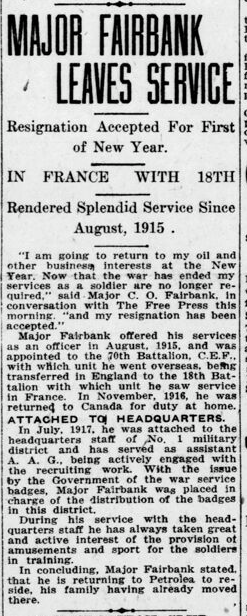 Family Search: When Major Charles Oliver Fairbank was born on 21 July 1858, in Niagara Falls, Niagara, Ontario, Canada, his father, John Henry Fairbank, was 27 and his mother, Edna Ann Crysler, was 29. He married Clara Mable Sussex on 11 July 1900, in Bothwell, Kent, Ontario, Canada. They were the parents of at least 4 sons. He immigrated to Petrolia, Lambton, Ontario, Canada in 1922 and lived in Judicial Township 1, Santa Barbara, California, United States in 1910 and Lambton, Ontario, Canada in 1911. He registered for military service in 1916. In 1916, at the age of 58, his occupation is listed as oil operator in Petrolia, Lambton, Ontario, Canada. He died on 24 February 1925, in Santa Barbara, California, United States, at the age of 66, and was buried in Hillsdale Cemetery, Petrolia, Lambton, Ontario, Canada.