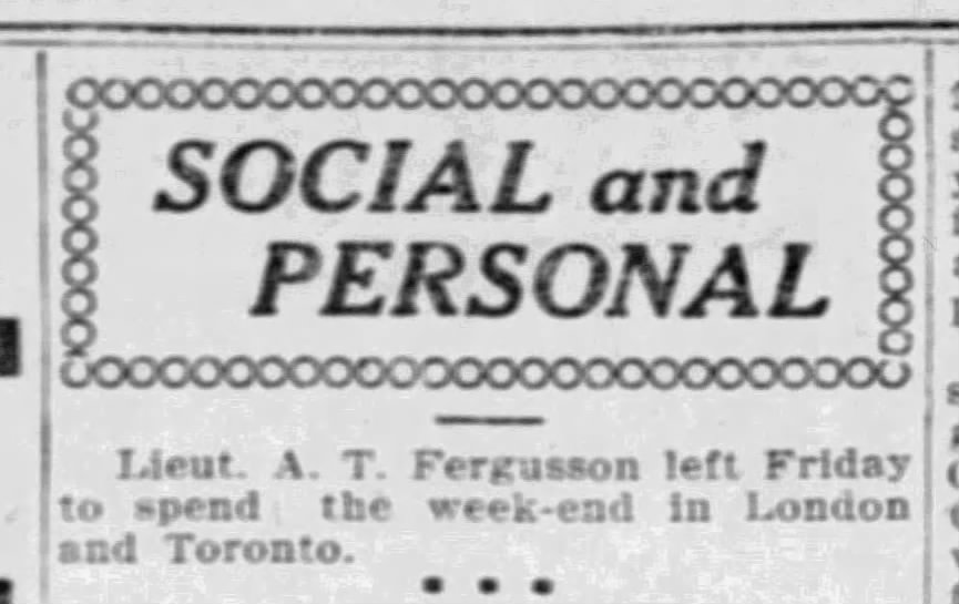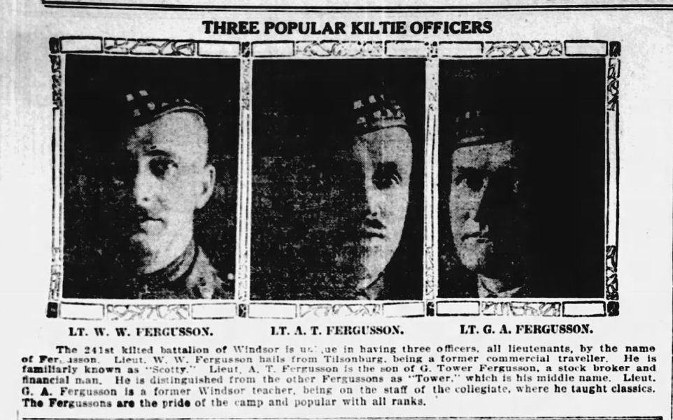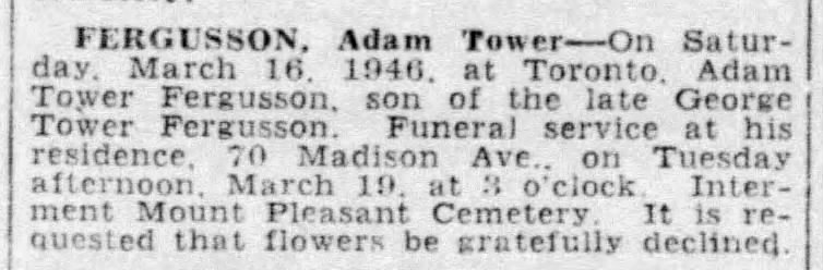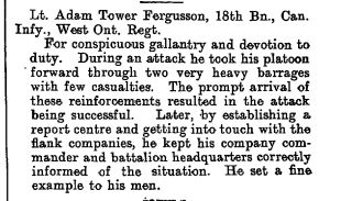 Family Search: When Lieutenant Adam Tower Fergusson MC was born on 12 January 1888, in Fergus, Wellington, Ontario, Canada, his father, George Tower Fergusson, was 55 and his mother, Margaret Moir, was 52. He lived in York, Ontario, Canada in 1901. He registered for military service in 1916. In 1916, at the age of 28, his occupation is listed as stock broker. He died on 16 March 1946, in Toronto, Ontario, Canada, at the age of 58, and was buried in Mount Pleasant Cemetery, Toronto, Ontario