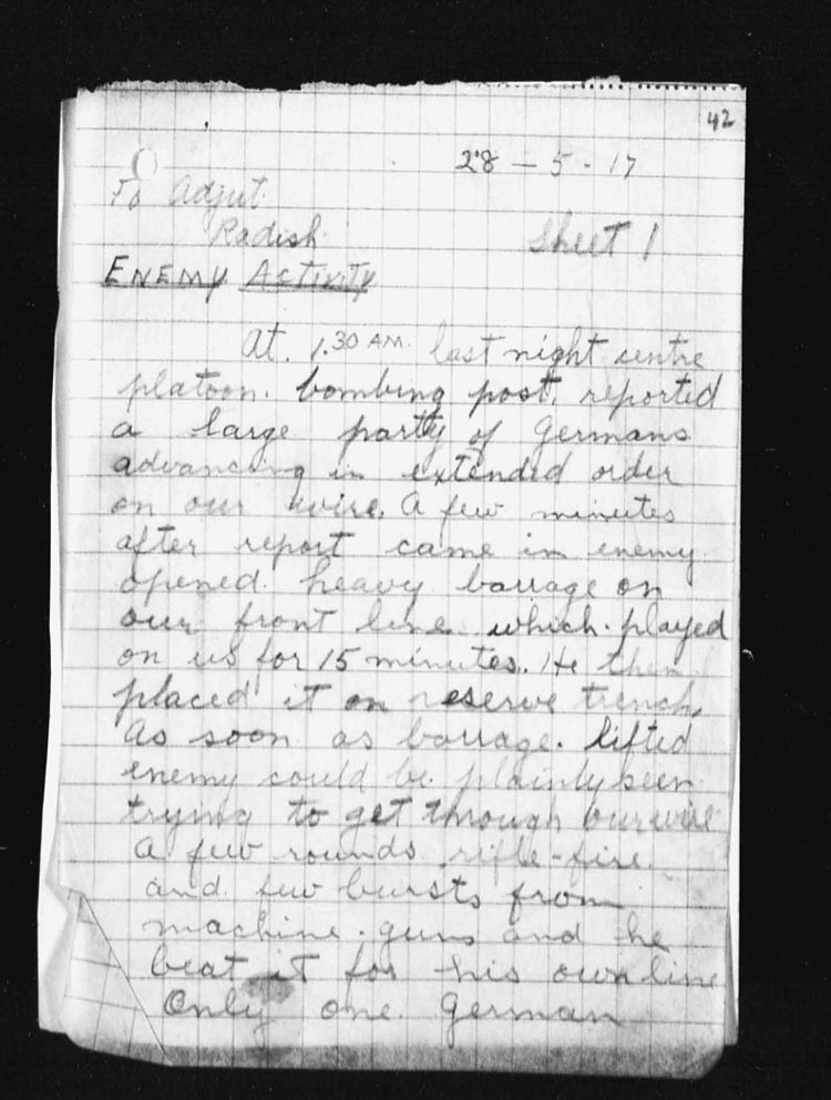 Wrote report regarding the German trench raid during the morning of May 28, 1917.