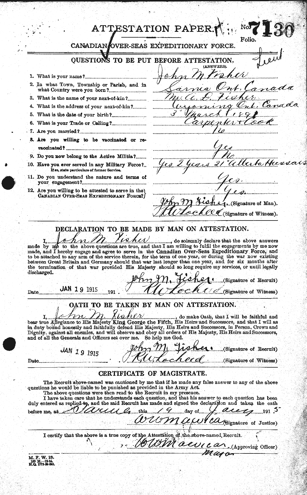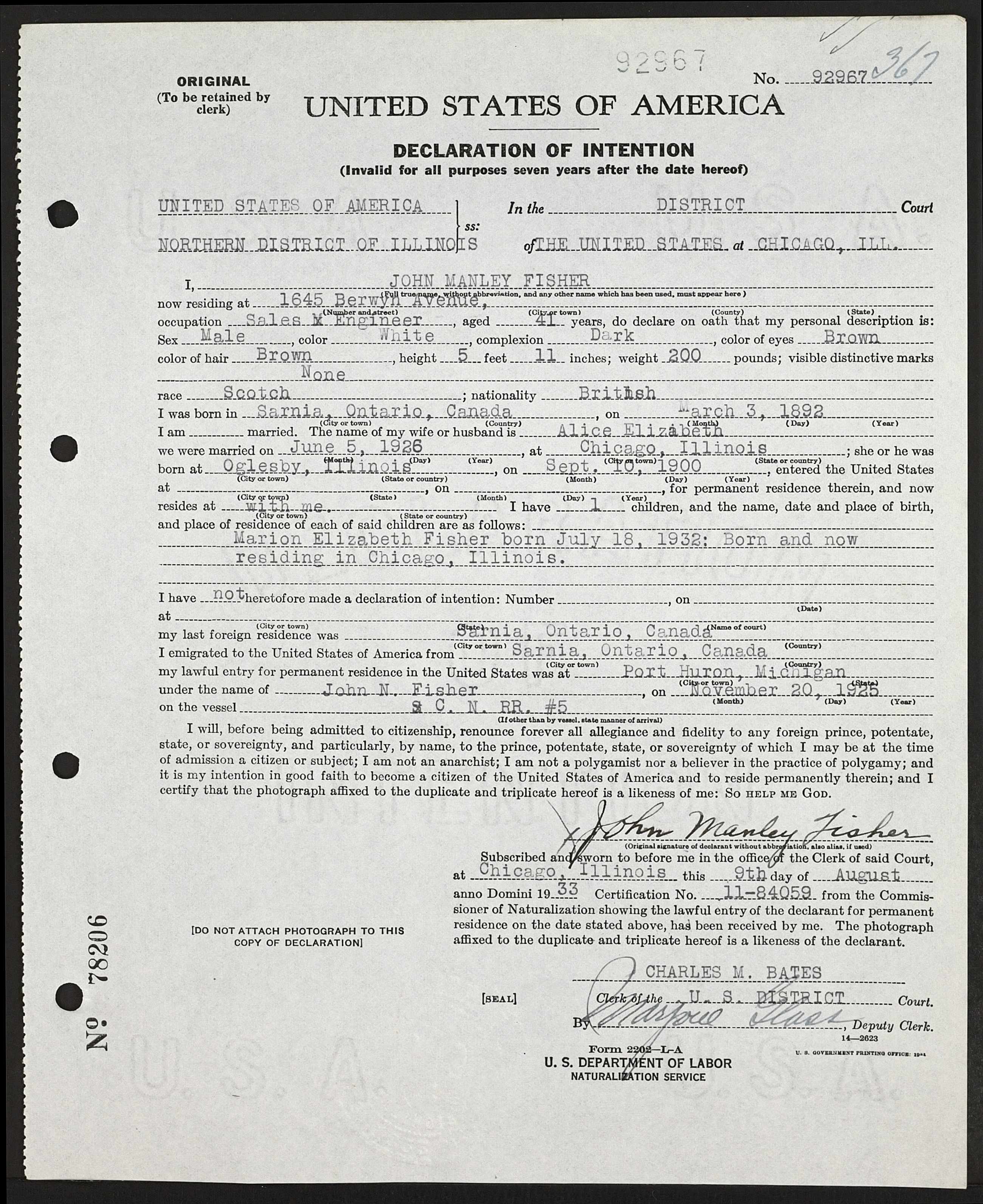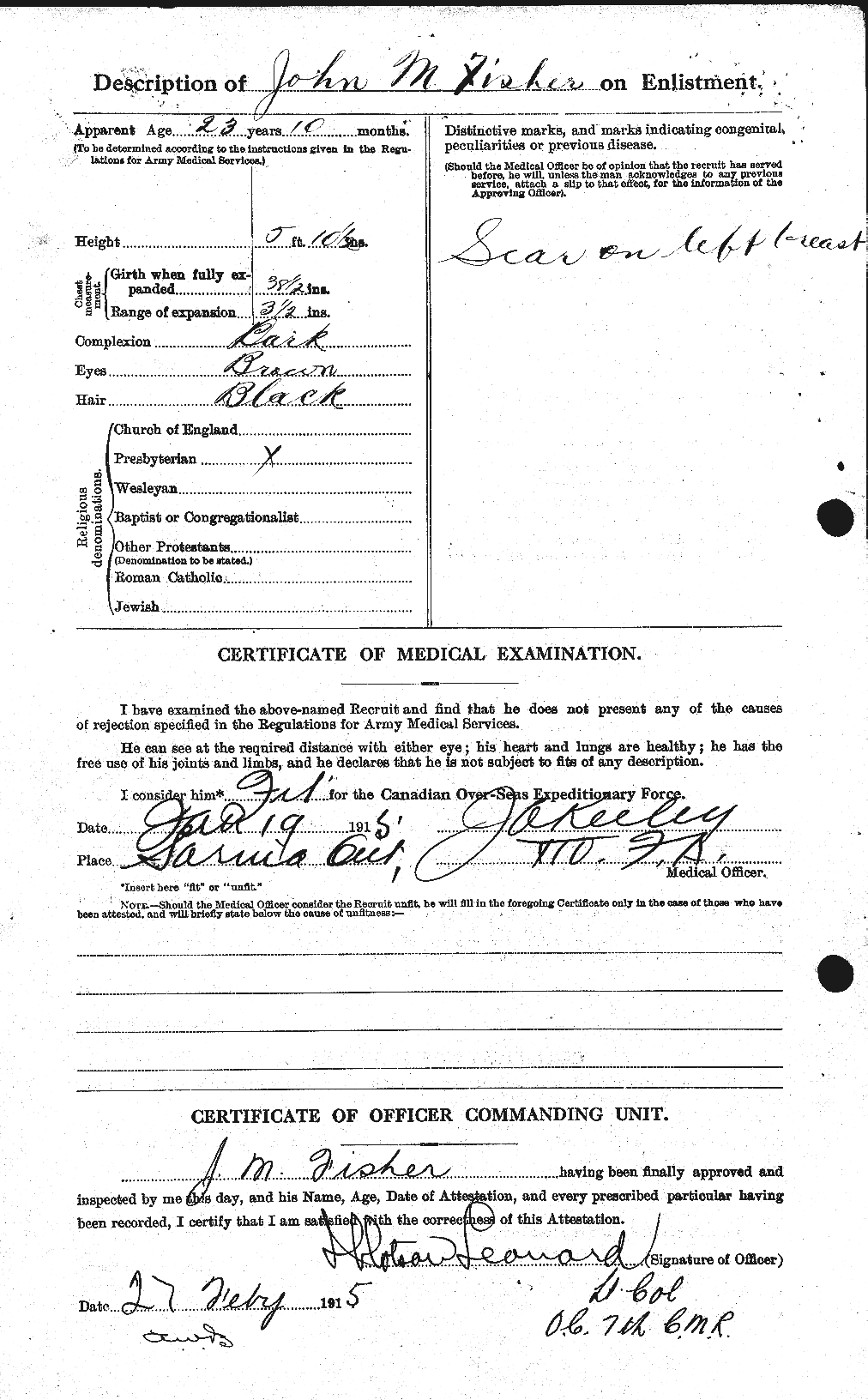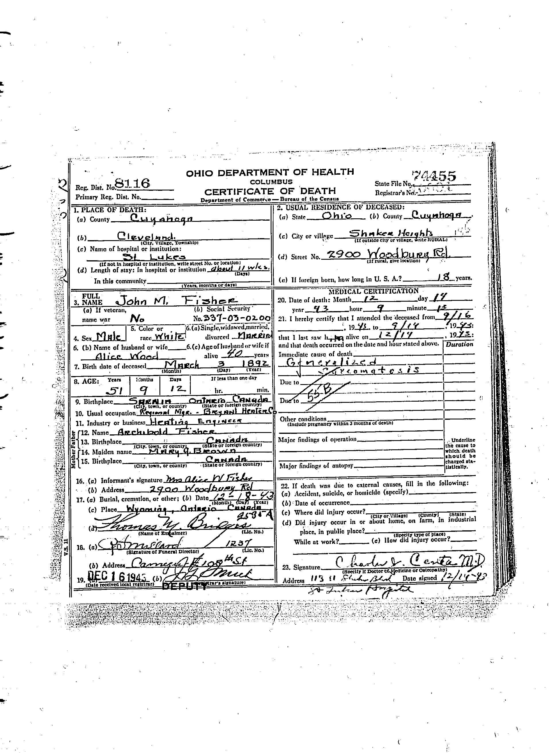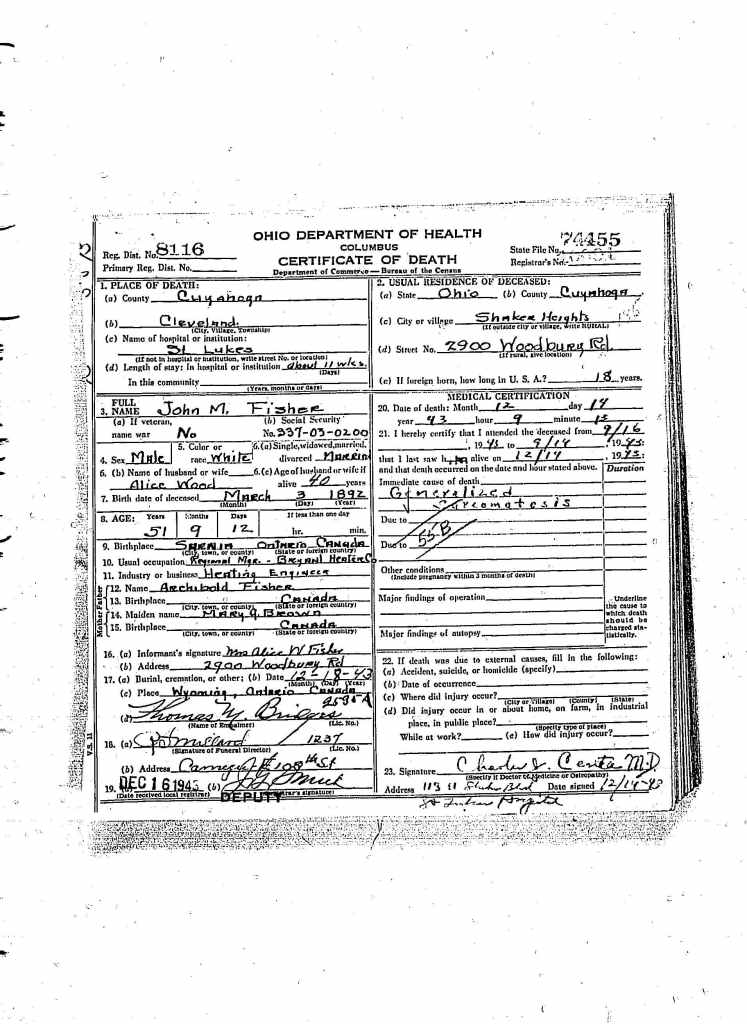 Family Search: When Captain John Matthew Fisher was born on 3 March 1892, in Sarnia, Lambton, Ontario, Canada, his father, Archibald Dewar Fisher, was 32 and his mother, Mary Glenn Brown, was 27. He married Alice Elizabeth Wood on 5 June 1926, in Chicago, Cook, Illinois, United States. They were the parents of at least 1 daughter. He immigrated to Port Huron, St. Clair, Michigan, United States in 1925 and lived in Chicago, Cook, Illinois, United States for about 5 years and Shaker Heights, Shaker Heights, Cuyahoga, Ohio, United States in 1940. He died on 14 December 1943, in Cleveland, Cuyahoga, Ohio, United States, at the age of 51, and was buried in Wyoming Cemetery, Wyoming, Lambton, Ontario, Canada.