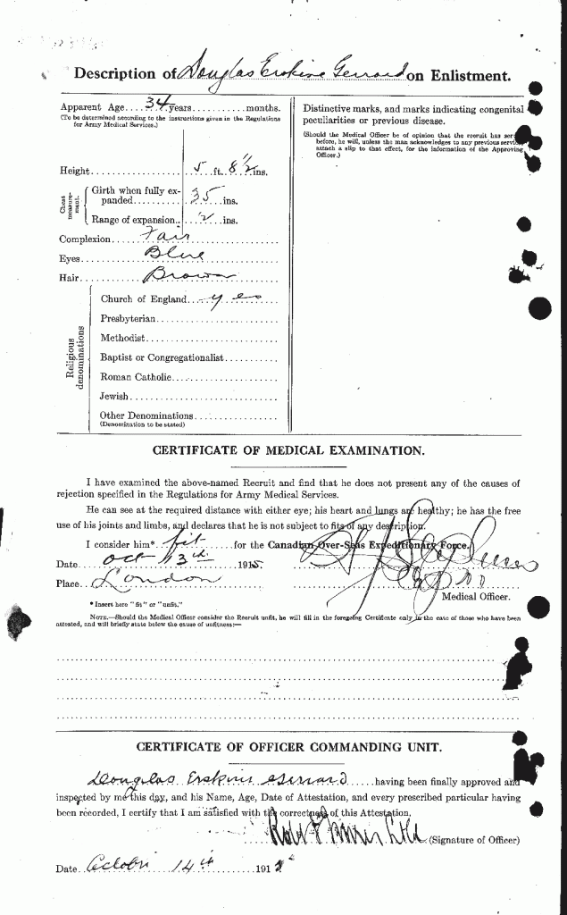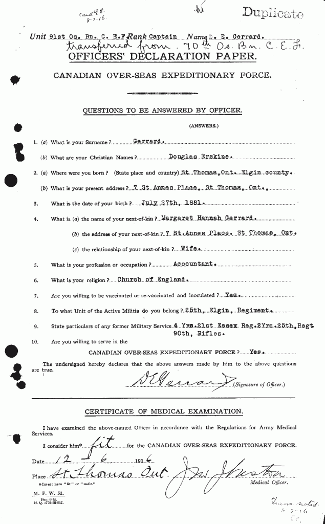 NOTE: this soldier’s service records shows service with the 19th Battalion and that research does not find any other soldier than this one as being the most likely candidate. Google search finds some images and bio. It is possible that the War Diary entry of August 13, 1918 is referring to Lieutenant Henry Rothewell Gerrard who joined the Battalion in December, 1916. More research will need to be done.