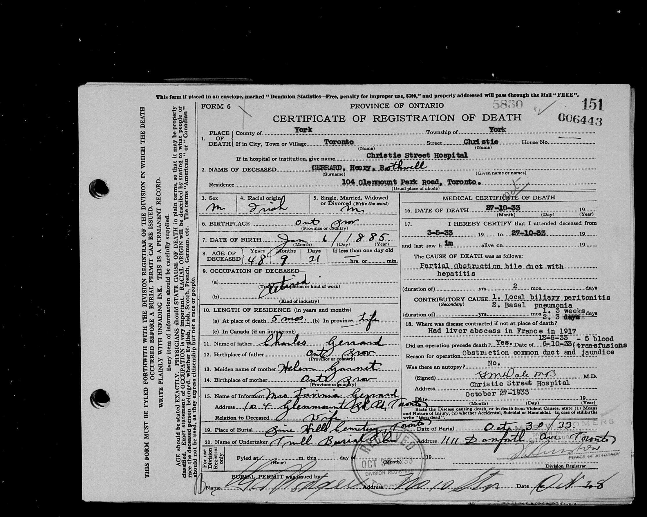 Family Search: When Lieutenant Henry Rothwell Gerrard was born on 6 January 1885, in Westminster Township, Middlesex, Ontario, Canada, his father, Charles Gerrard, was 35 and his mother, Helen Lydia Garnett, was 31. He married Lovina Kropf on 2 August 1924, in York, Ontario, Canada. He lived in St. Thomas, Elgin, Ontario, Canada in 1919 and Toronto, York, Ontario, Canada in 1933. He registered for military service in 1916. In 1916, at the age of 31, his occupation is listed as merchant in Charlton, Timiskaming, Ontario, Canada. He died on 27 October 1933, in York, Toronto, York, Ontario, Canada, at the age of 48, and was buried in Pine Hills Cemetery, Scarborough, Toronto, Ontario, Canada.