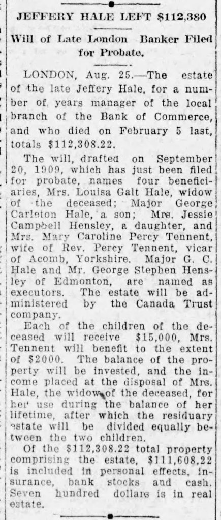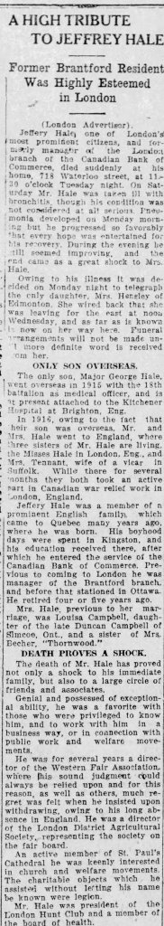 HALE, GEORGE CARLTON: Physician: 20 Hyman Court Apts, London, Ont. Son of Jeffery Hale, Brantford, Ont.; Arts ’03-’04; M.D., C.M. (McGill); C.A.M.C. Lt., M.O. 7th Fusiliers; Capt., C.A.M.C., December 14, 1914; M.O. 18th Bn.; O.S. April 15, 1915; France, September 15, 1915; St. Eloi, 1915; Trench Fever, invalided to England, May 20, 1916; Can. Red. Cross Hosp., Taplow; Standing Medical Board, Shoreham, England, Med. Referee; Kitchener Hosp., Brighton; Despatches, June 15, 1916; mentioned for services, 1917; Major, January d31, 1918; ret’d to Canada March, 1918; O.C. Mily. Hosp., M.D. No. 1; retired March 1, 1919.