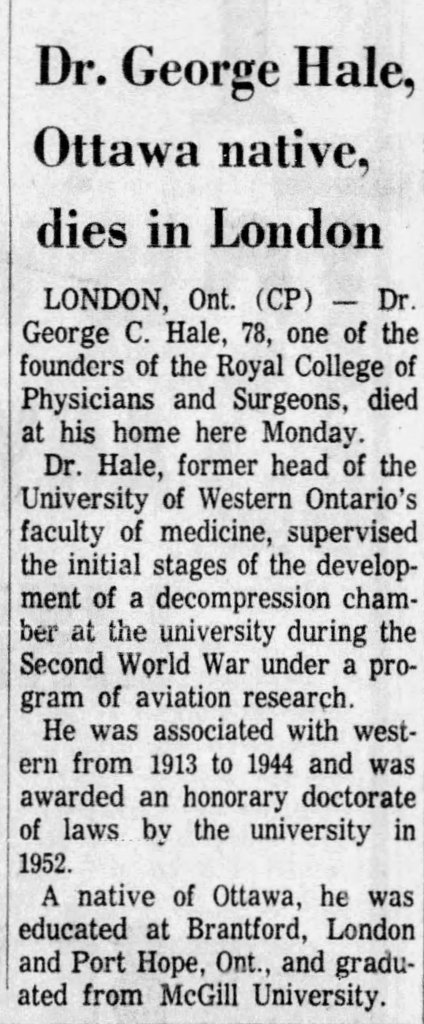 Dr. George C. Hale was born in Ottawa in 1885. He graduated from McGill with an M.D. in 1909. Interning at Montreal General Hospital for two years, Dr. Hale completed postgraduate work in London, Berlin, Munich, and Vienna.