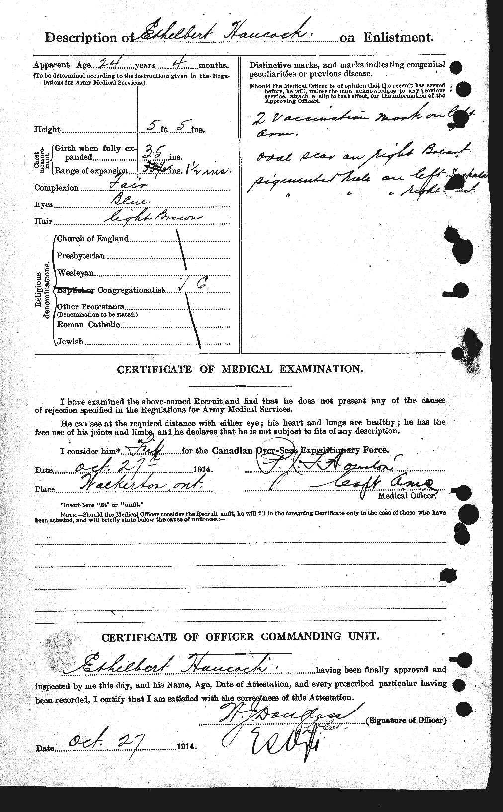 Family Search: Private Ethelbert Hancock was born on 21 June 1890, in Shropshire, England, United Kingdom as the son of George Hancock and Prudence Hughes. He married June Kallan on 3 December 1918, in London, Ontario, Canada. He immigrated to Quebec City, Quebec, Canada in 1913 and lived in Chesley, Bruce, Ontario, Canada in 1922. He registered for military service in 1914. In 1914, at the age of 24, his occupation is listed as bookeeper in Chesley, Bruce, Ontario, Canada. He died on 25 March 1957, in Brentwood, Essex, England, United Kingdom, at the age of 66, and was buried in Shrewsbury, Shropshire, England, United Kingdom.