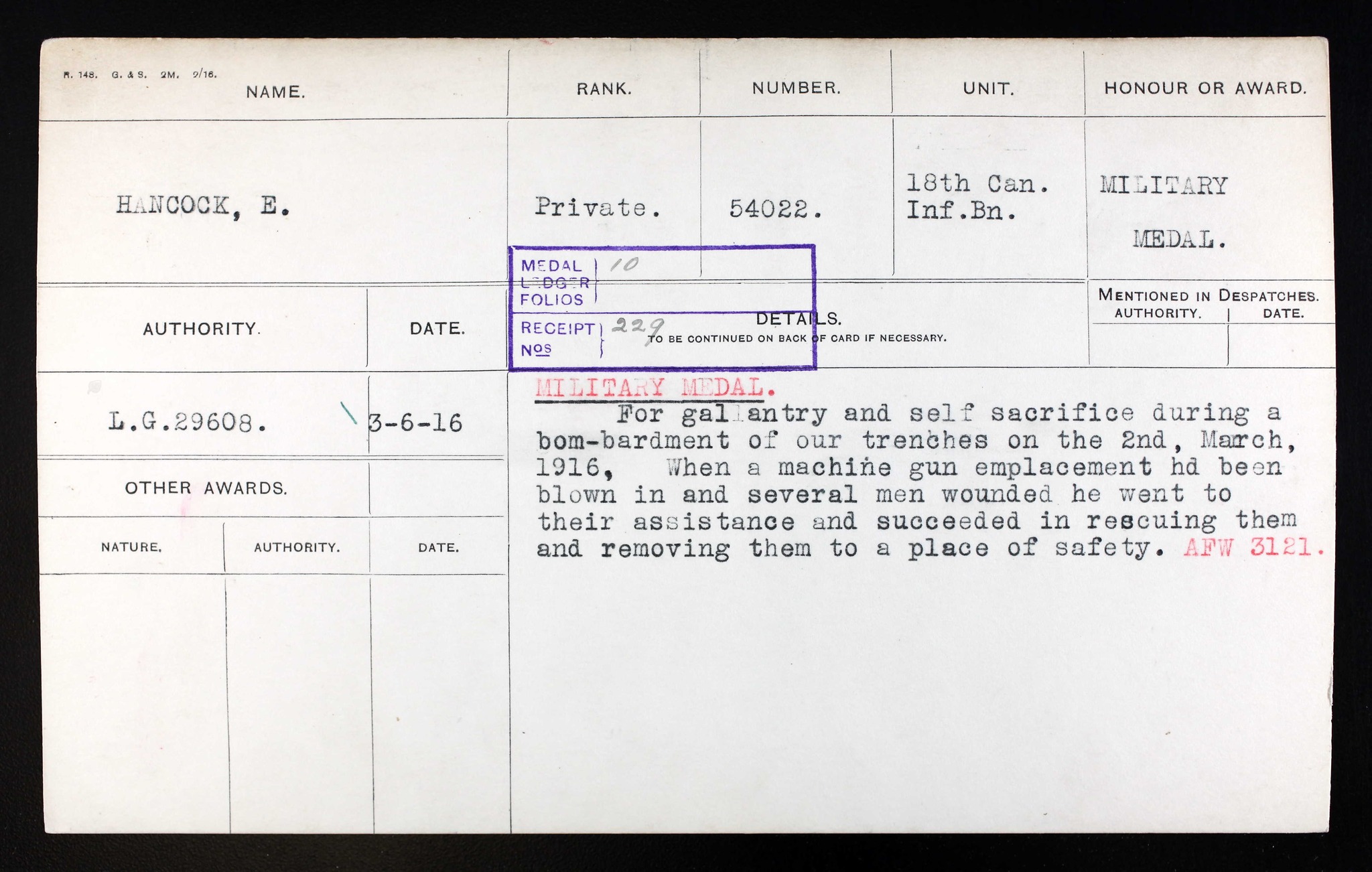 “For gallantry and self sacrifice during a bombardment of our trenches on the 2nd, March, 1916. When a machine gun emplacement had been blown in and several men wounded he went to their assistance and succeeded in rescuing them and removing them to a place of safety.”