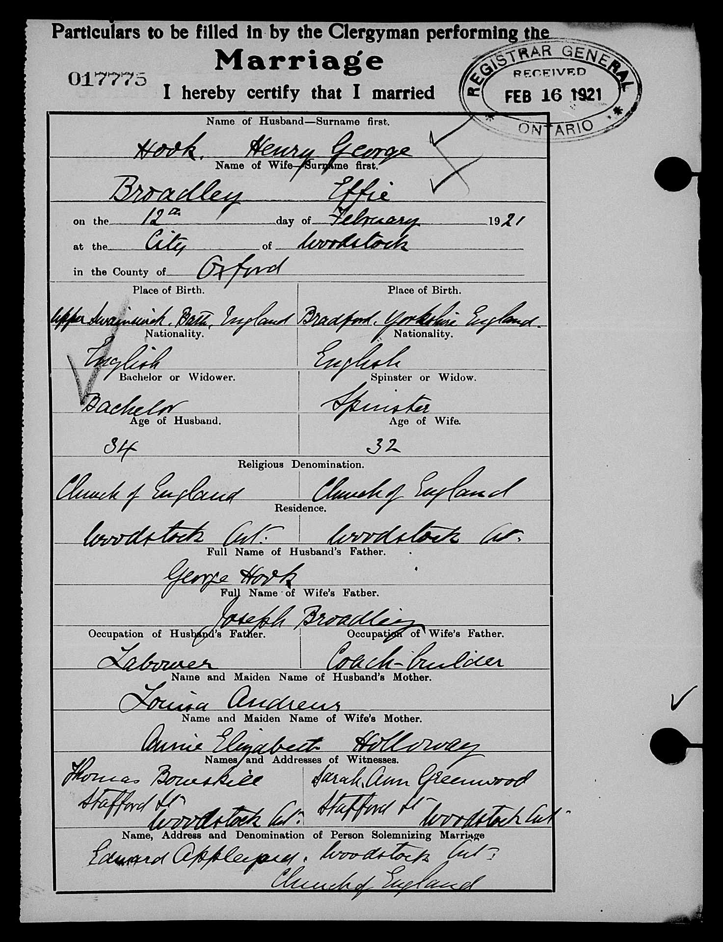 He married Effie Broadley in Woodstock, Ontario, 12 Feb 1921. Effie was born ~1889 in Yorkshire, England.
