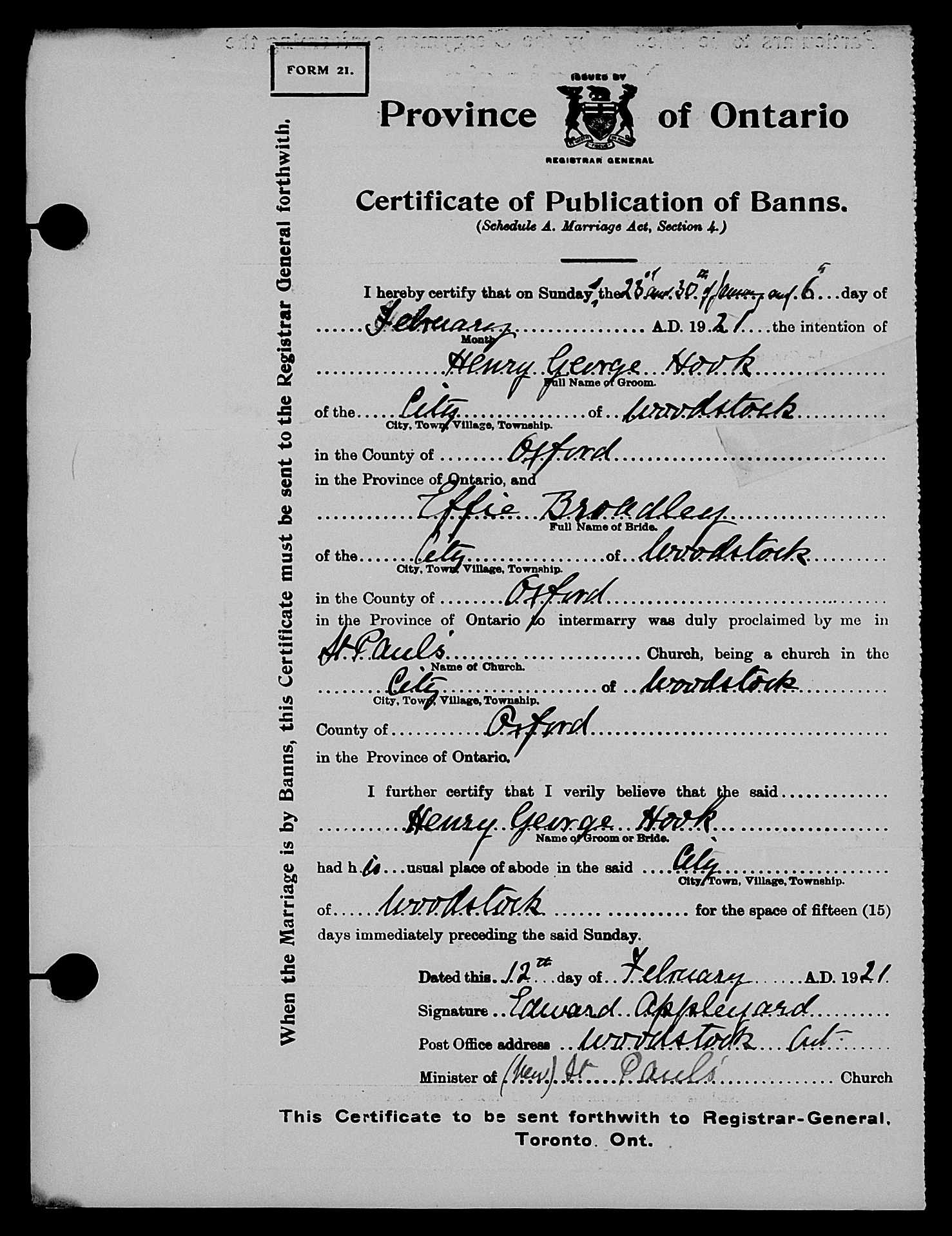 Canada 1921 Census records show him and Effie in Woodstock. There is also listed a 5yr old son “Benjamin”. Though as he and Effie were married in 1921, and the census indicates Effie and Benjamin immigrated to Canada in 1921, I suspect he is not Henry George’s natural son, and was born to Effie out of wedlock in Yorkshire England (She is listed as a spinster, not widow in her marriage record). There is an index record of a Benjamin Broadley being born in Yorkshire, 1916, but no further details on mother and father.