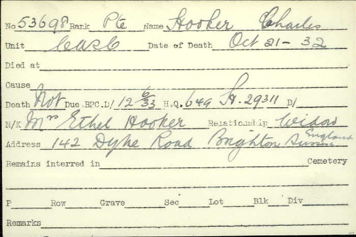 Family Search: When Private Charles Miles Hooker was born on 30 January 1893, in Brighton, Sussex, England, United Kingdom, his father, William Hooker, was 25 and his mother, Minnie Richardson, was 23. He had at least 1 daughter with Ethel Carrie Hughes. He immigrated to Canada in 1914 and lived in Canada in 1914 and Sussex, England, United Kingdom in 1921. He registered for military service in 1914. In 1914, at the age of 21, his occupation is listed as machine helper. He died on 21 October 1932, in Brighton, Sussex, England, United Kingdom, at the age of 39.