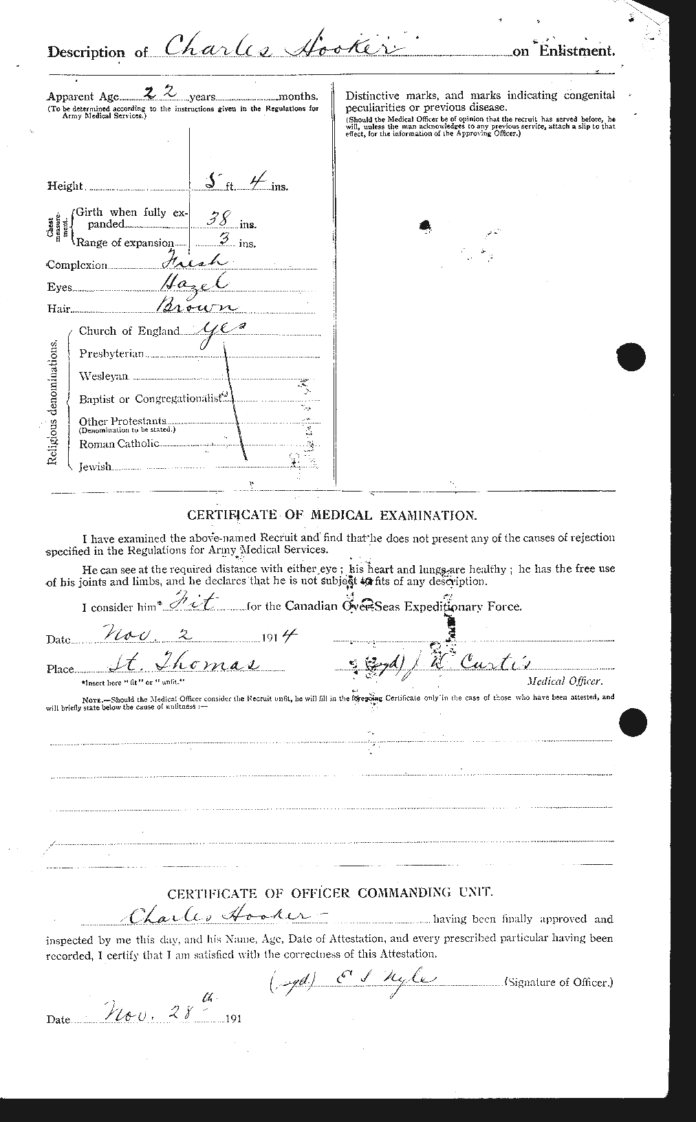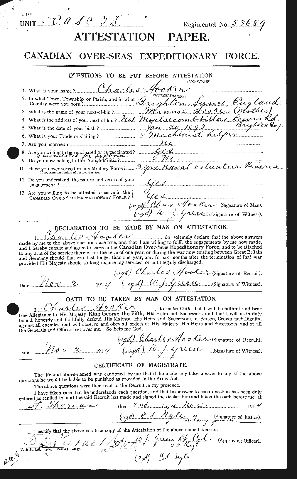 Family Search: When Private Charles Miles Hooker was born on 30 January 1893, in Brighton, Sussex, England, United Kingdom, his father, William Hooker, was 25 and his mother, Minnie Richardson, was 23. He had at least 1 daughter with Ethel Carrie Hughes. He immigrated to Canada in 1914 and lived in Canada in 1914 and Sussex, England, United Kingdom in 1921. He registered for military service in 1914. In 1914, at the age of 21, his occupation is listed as machine helper. He died on 21 October 1932, in Brighton, Sussex, England, United Kingdom, at the age of 39.
