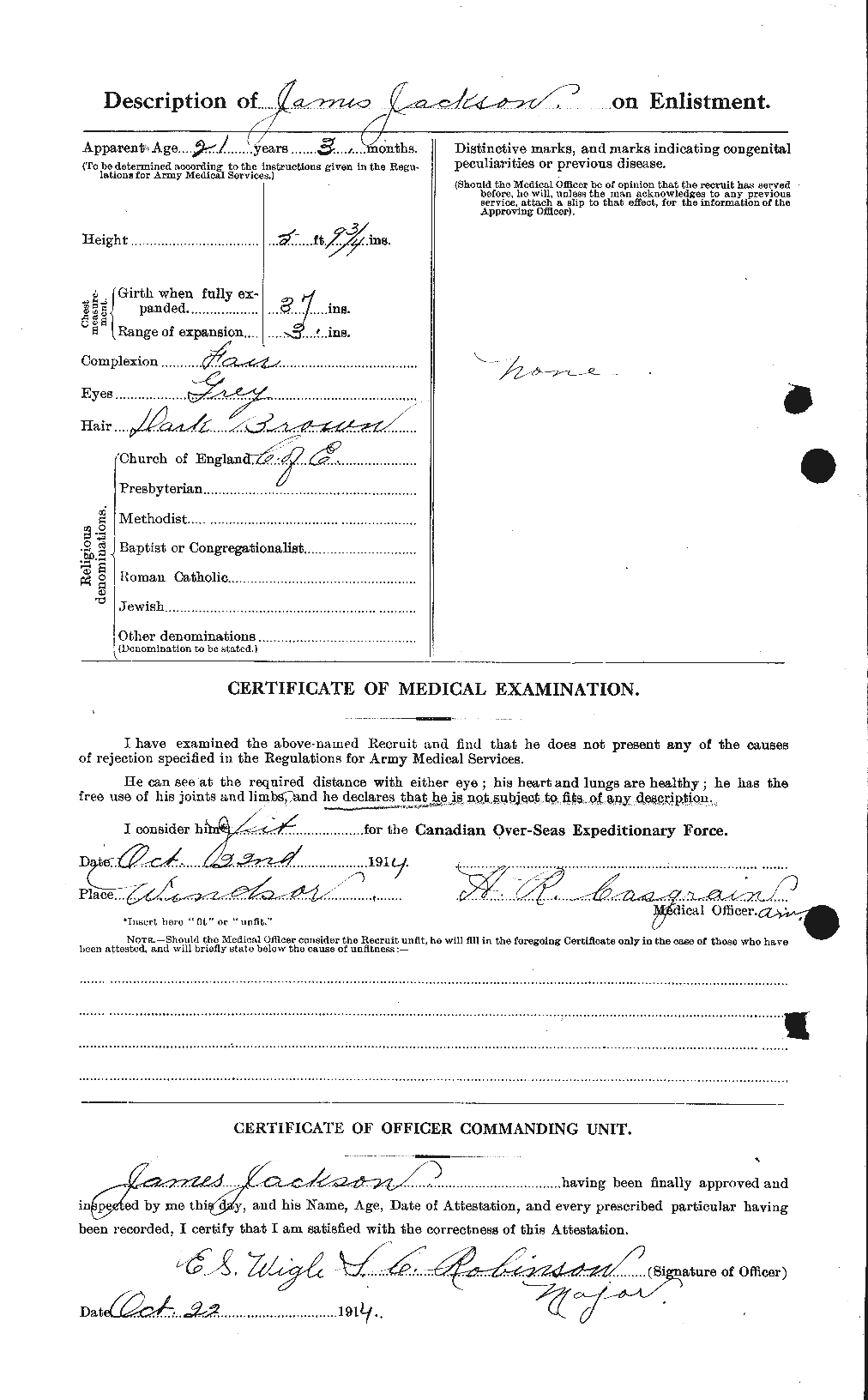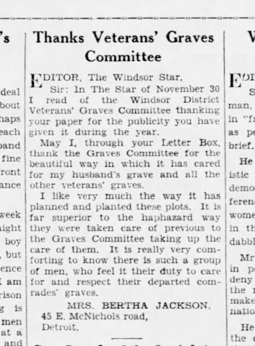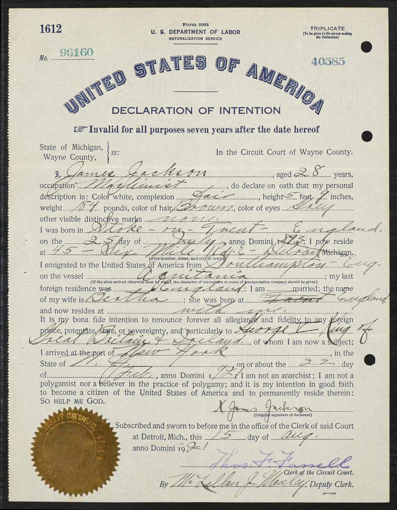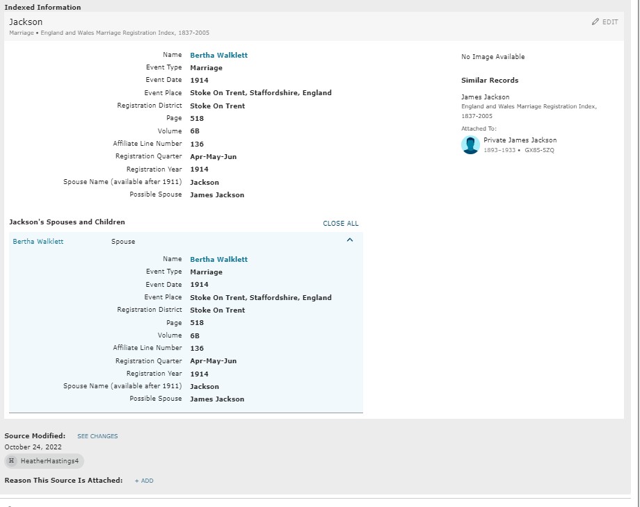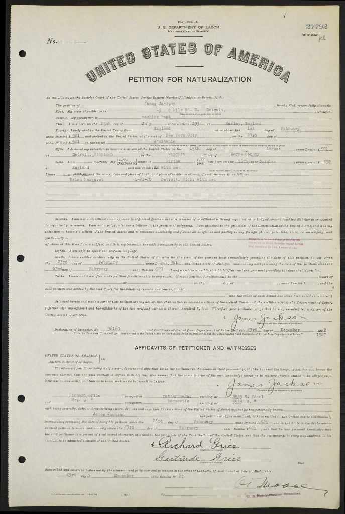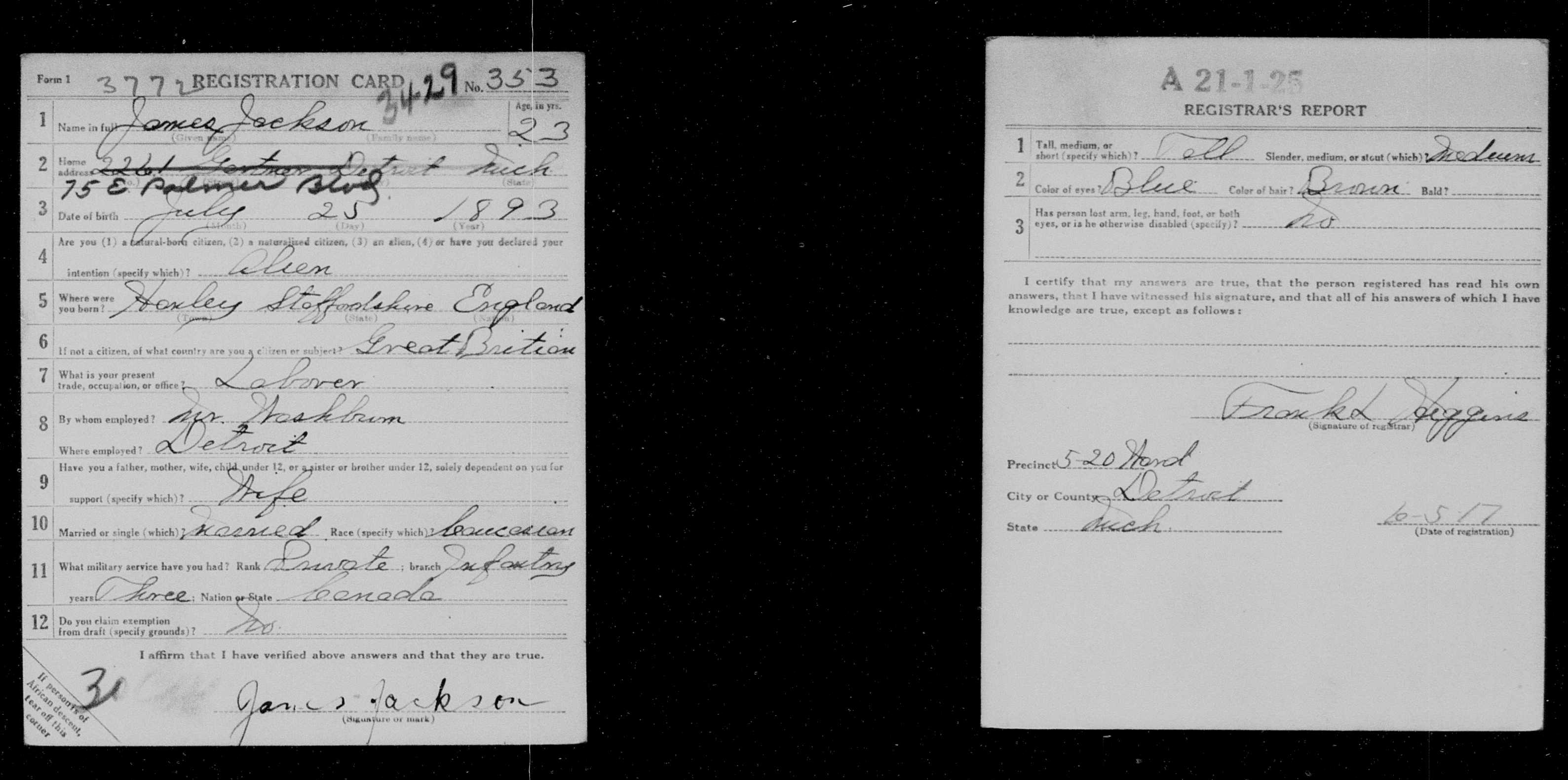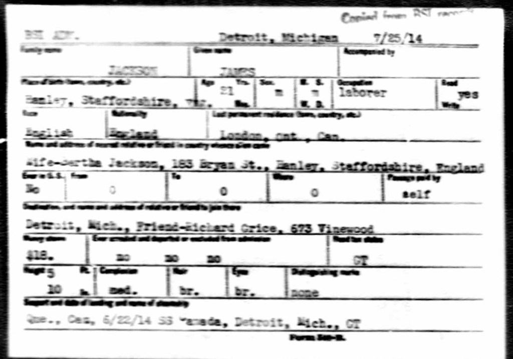 Family Search: When Private James Jackson was born on 25 July 1893, in Hanley, Staffordshire, England, United Kingdom, his father, Joseph Jackson, was 33 and his mother, Ellen Lovett, was 41. He married Bertha Walklett in 1914, in Stoke on Trent, Staffordshire, England, United Kingdom. They were the parents of at least 1 daughter. He immigrated to United States in 1921 and lived in Wayne, Michigan, United States in 1920. He registered for military service in 1914. In 1914, at the age of 21, his occupation is listed as brass roller. He died on 2 May 1933, in Detroit, Wayne, Michigan, United States, at the age of 39, and was buried in Windsor Grove Cemetery, Windsor, Essex, Ontario, Canada.