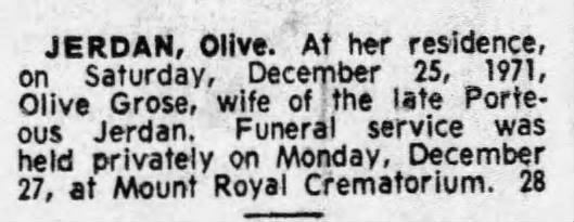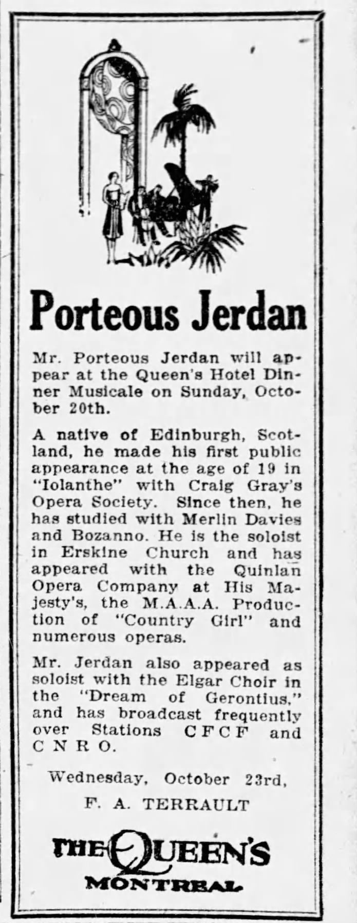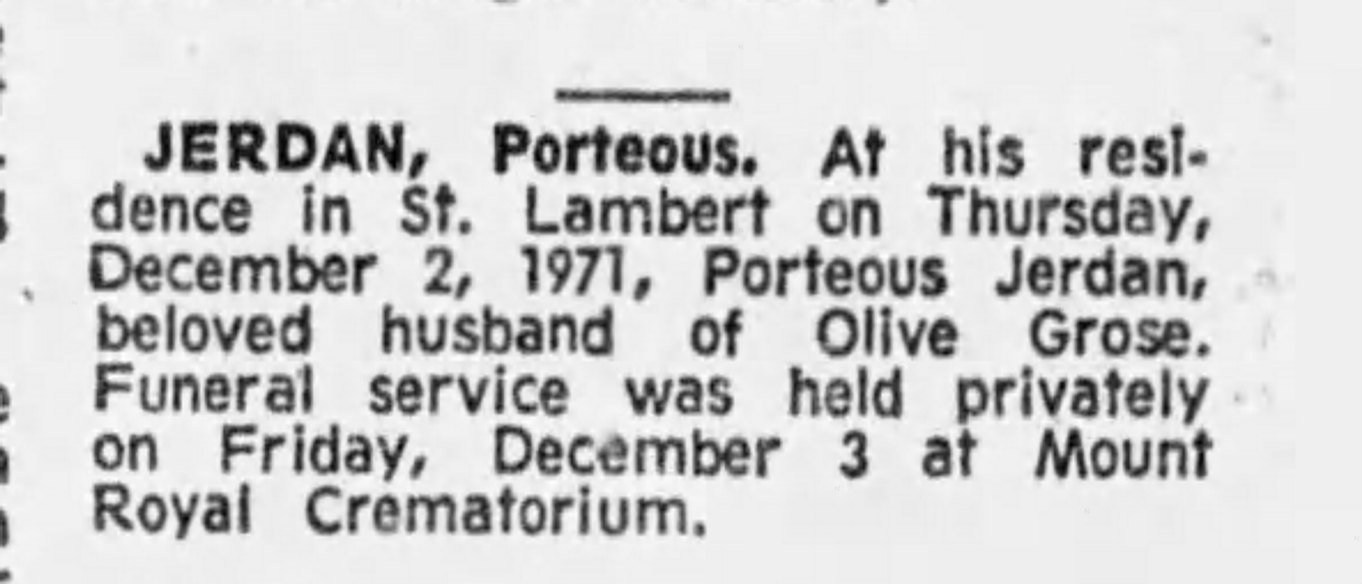 Family Search: When Porteous Jerdan was born on 18 March 1890, in Colinton, Edinburgh, Scotland, United Kingdom, his father, Gabriel Jerdan, was 40 and his mother, Anna Purves Porteous, was 31. He immigrated to New York City, New York, United States in 1935 and lived in Dalkeith, Midlothian, Scotland, United Kingdom in 1901 and Montreal, Quebec, Canada in 1922. He registered for military service in 1916. In 1916, at the age of 26, his occupation is listed as insurance in Perth, Lanark, Ontario, Canada. He died on 2 December 1971, in Montreal, Montreal Urban Community, Quebec, Canada, at the age of 81, and was buried in Cimetière Mont-Royal, Outremont, Montréal, Quebec, Canada.