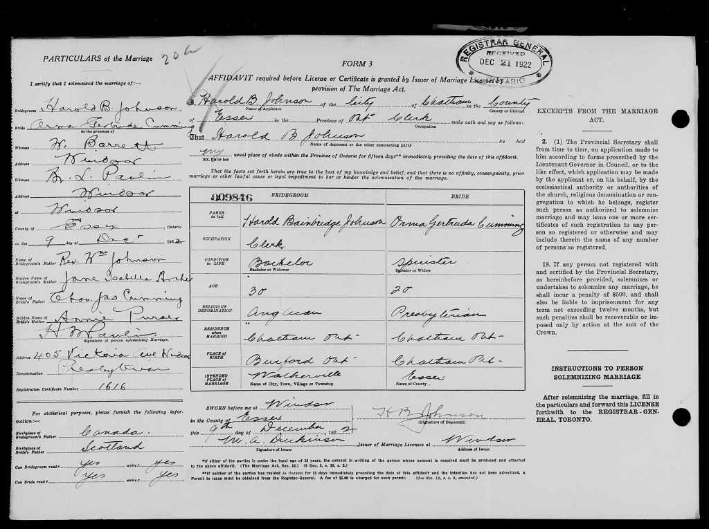 Family Search: When Lieutenant Harold Burford Bainbridge Johnson was born on 16 January 1889, in Oxford, Ontario, Canada, his father, William Johnson, was 36 and his mother, Jane Isabella Archer, was 37. He married Orma Gertrude Cumming on 9 December 1922, in Windsor, Essex, Ontario, Canada. They were the parents of at least 3 sons and 1 daughter. He lived in Woodstock, Oxford, Ontario, Canada in 1916. He registered for military service in 1916. In 1916, at the age of 27, his occupation is listed as bank clerk in Woodstock, Oxford, Ontario, Canada. He died on 2 April 1975, at the age of 86.