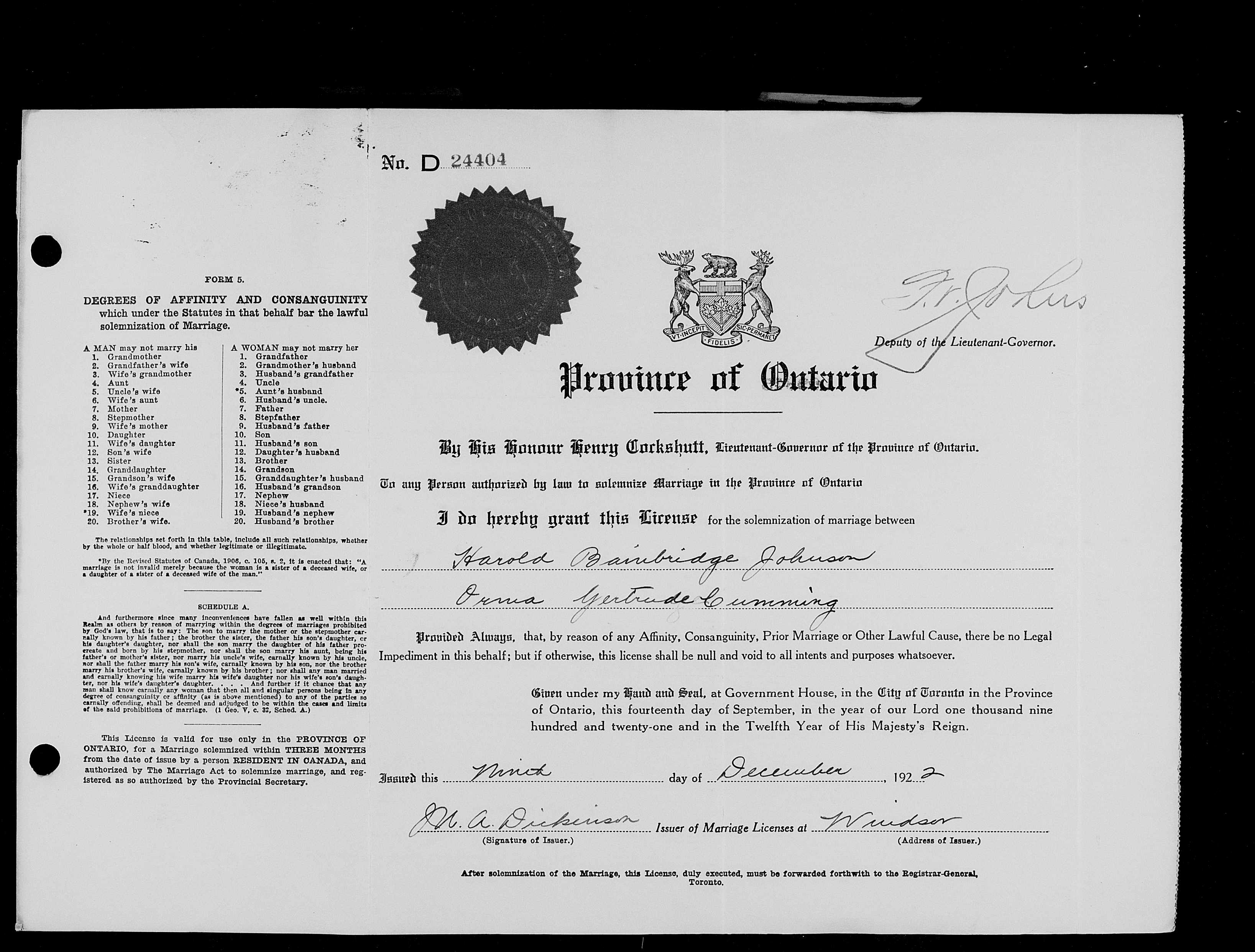 Family Search: When Lieutenant Harold Burford Bainbridge Johnson was born on 16 January 1889, in Oxford, Ontario, Canada, his father, William Johnson, was 36 and his mother, Jane Isabella Archer, was 37. He married Orma Gertrude Cumming on 9 December 1922, in Windsor, Essex, Ontario, Canada. They were the parents of at least 3 sons and 1 daughter. He lived in Woodstock, Oxford, Ontario, Canada in 1916. He registered for military service in 1916. In 1916, at the age of 27, his occupation is listed as bank clerk in Woodstock, Oxford, Ontario, Canada. He died on 2 April 1975, at the age of 86.