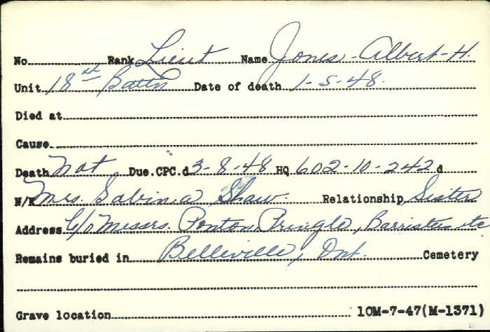 Family Search: When Lieutenant Albert Henry Jones was born on 1 January 1893, in Rotherham, Yorkshire, England, United Kingdom, his father, Alfred Jones, was 28 and his mother, Mary, was 26. He immigrated to Canada in 1913 and lived in Bradfield, Yorkshire, England, United Kingdom for about 10 years and Trenton, Hastings, Ontario, Canada in 1922. He registered for military service in 1914. In 1914, at the age of 21, his occupation is listed as machinist. He died on 1 May 1948, in Belleville, Hastings, Ontario, Canada, at the age of 55, and was buried in Avondale Cemetery, Stratford, Perth, Ontario, Canad