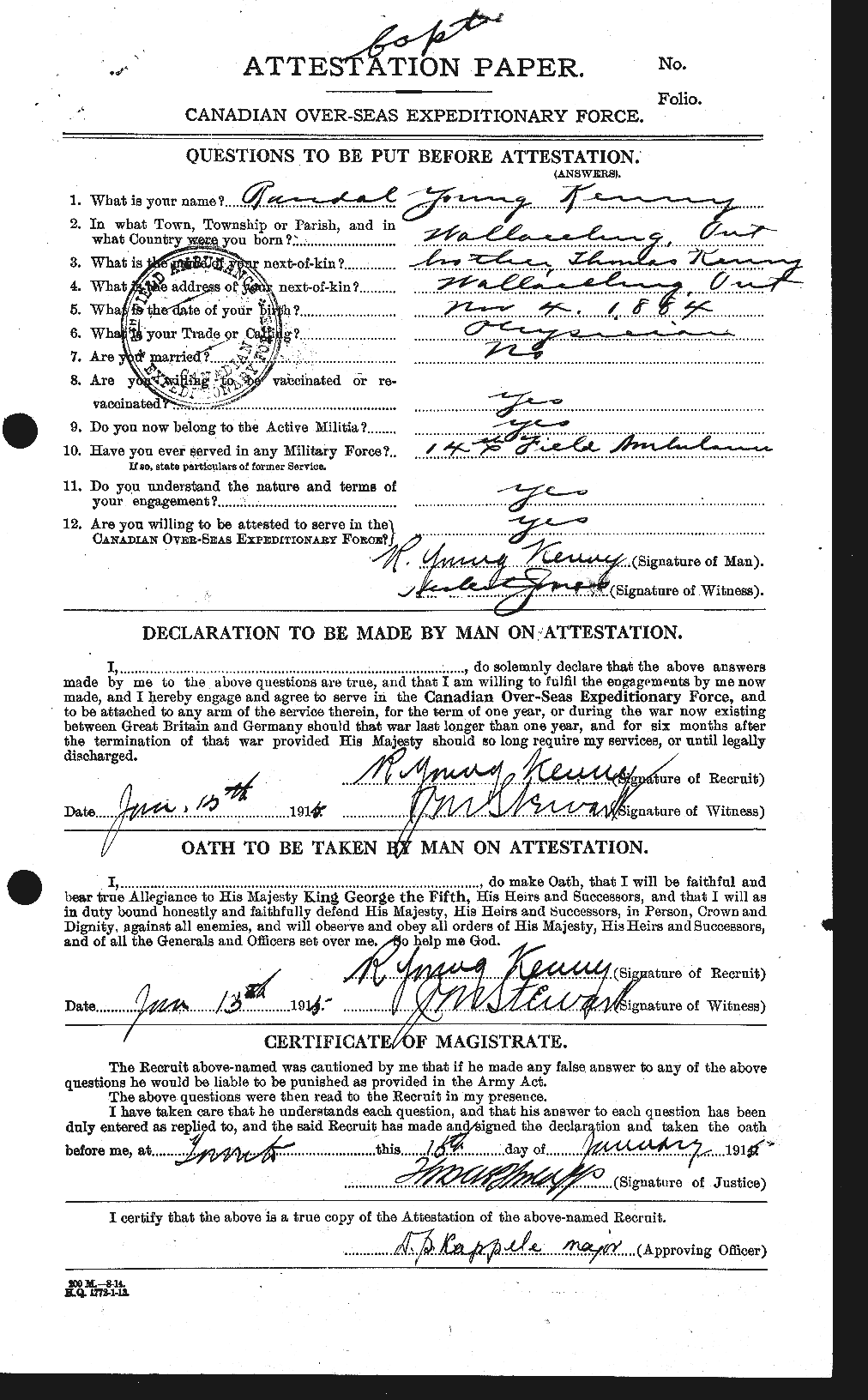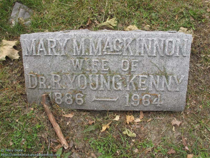 Family Search: Randall Young Kenny was born on 4 March 1885, in Wallaceburg, Kent, Upper Canada, British Colonial America as the son of William Kenny and Mary Jane Watts. He married Mary Margaret MacKinnon on 5 October 1922, in Caledonia, Haldimand, Ontario, Canada. They were the parents of at least 1 son. He immigrated to Canada in 1922. He died on 4 October 1984, in Canada, at the age of 99, and was buried in Lakeview Cemetery, Sarnia, Lambton, Ontario, Canada.