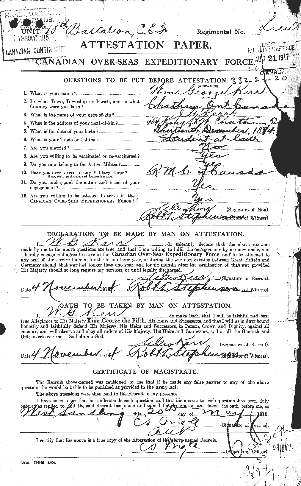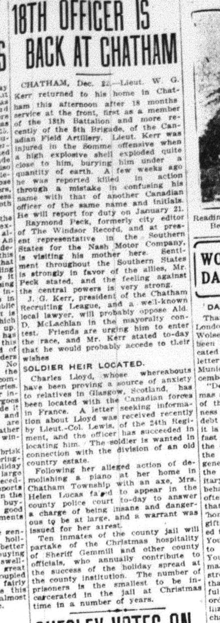 Lieutenant William George Kerr left Canada April 18th, 1915, with the 18th Battalion and reached the front September 14th, 1915. He was transferred to the 4th Brigade Canadian Field Artillery in April 1916, serving until November 1916, when he was invalided to England, thence to Canada, and retired as unfit in September 1917.