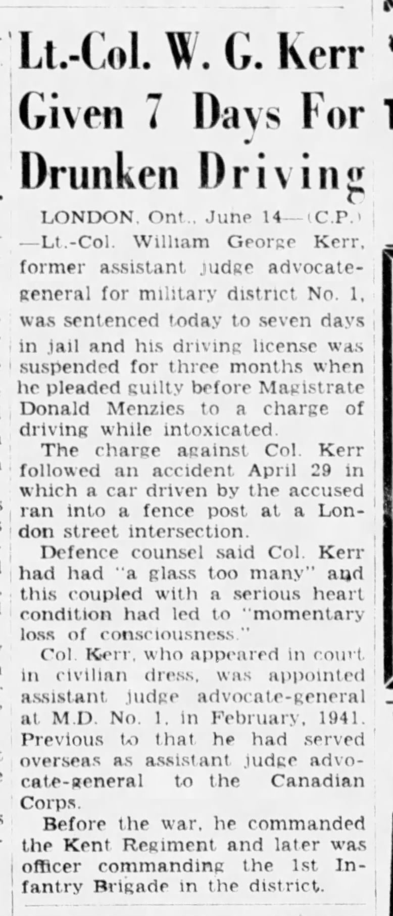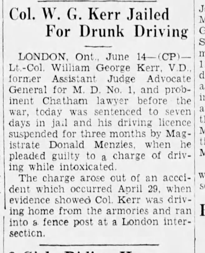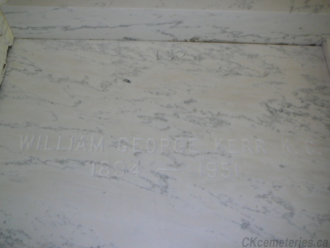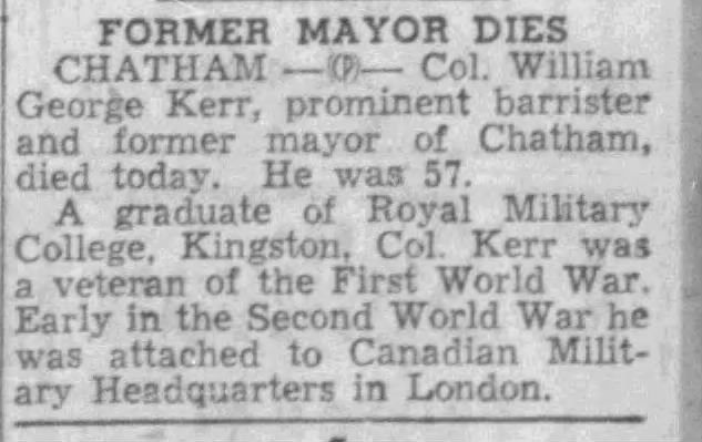 Family Search: When William George Kerr was born on 13 December 1894, in Chatham, Kent, Ontario, Canada, his father, John Garner Kerr Sr, was 26 and his mother, Georgina Louise McLean, was 24. He married Gladys Lillian May McRitchie on 11 June 1919, in Chatham, Kent, Ontario, Canada. He lived in Ontario, Canada in 1894 and Kent, Ontario, Canada in 1911. He registered for military service in 1914. His occupation is listed as mayor of chatham in Chatham, Kent, Ontario, Canada. He died on 19 December 1951, in Chatham, Kent, Ontario, Canada, at the age of 57, and was buried in Maple Leaf Cemetery, Chatham, Chatham-Kent, Ontario, Canada.