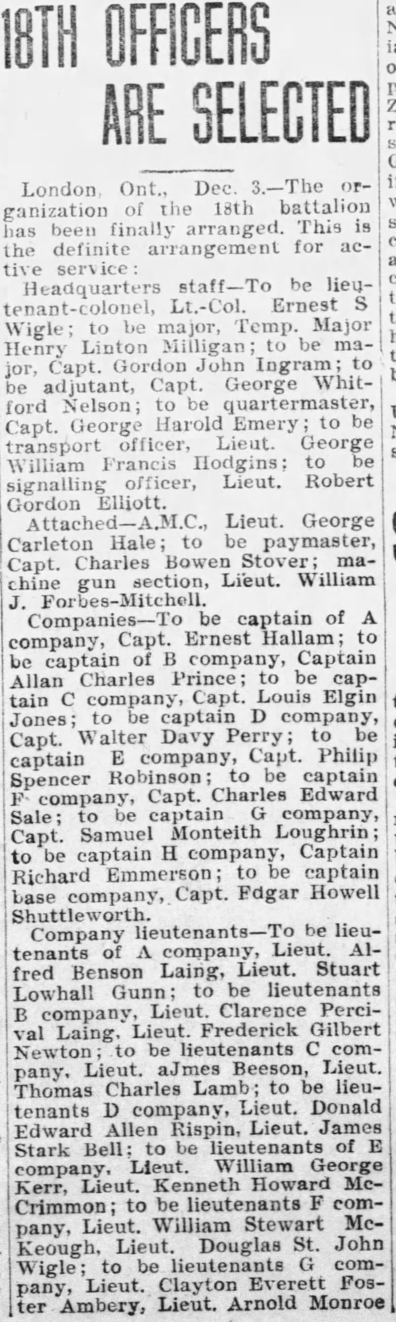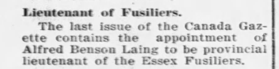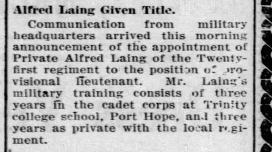 Went to Trinity College: 1905″ LAING. Alfred Benson, Capt., A. Co., 18th Bn., 2nd C.E.F.