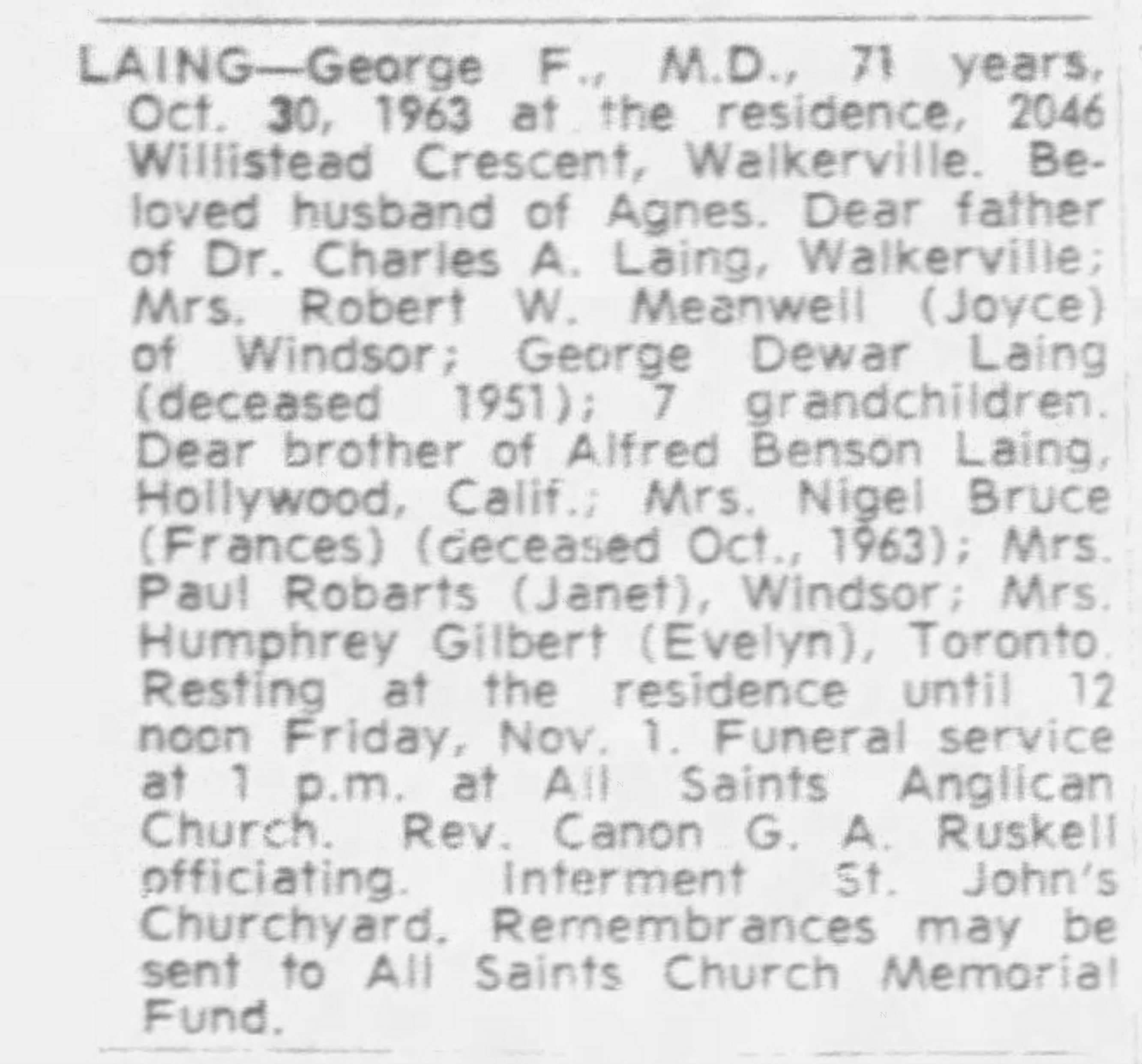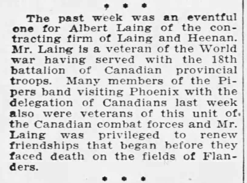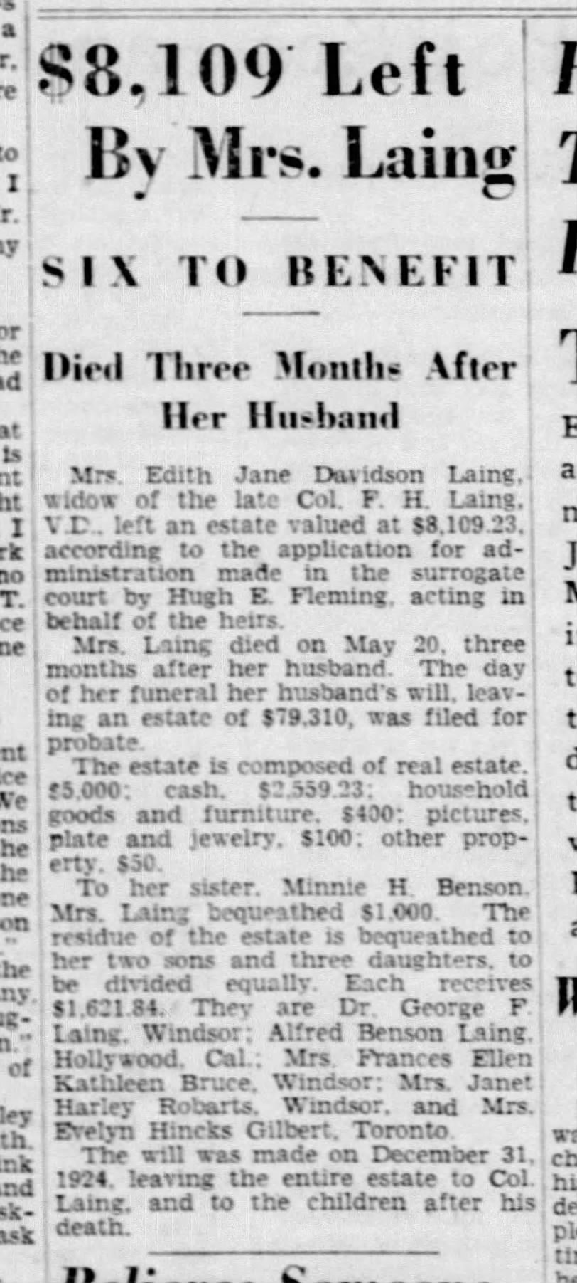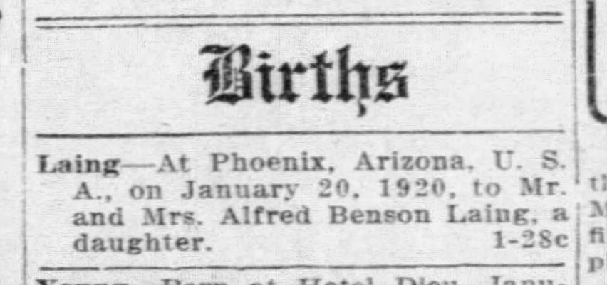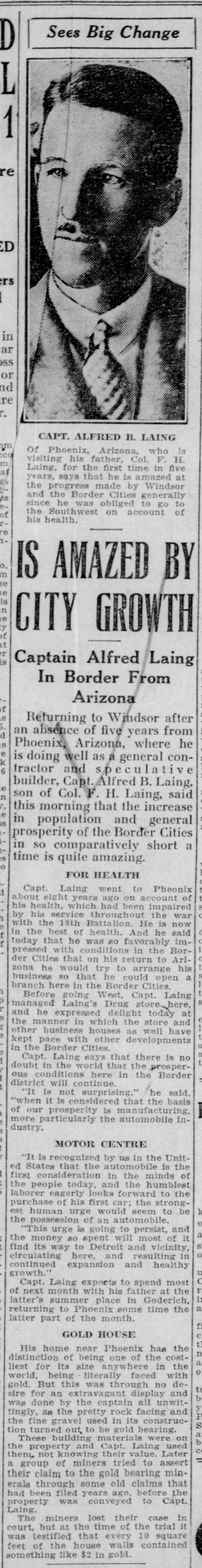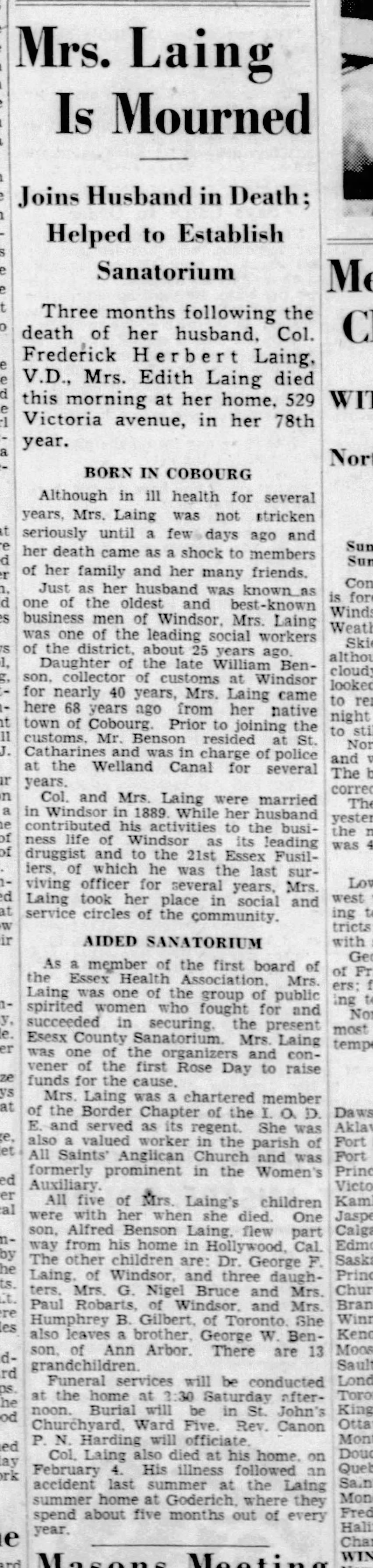 Family Search: When Captain Alfred Benson Laing was born on 6 January 1890, in Windsor, Sandwich, Essex, Ontario, Canada, his father, Colonel Frederick Herbert Laing, was 33 and his mother, Edith Jane Davidson Benson, was 30. He married Nora Hammersley-Heenan on 30 September 1917, in Finchley, Barnet, London, England, United Kingdom. They were the parents of at least 1 son and 1 daughter. He lived in Essex, Essex, Ontario, Canada in 1911 and Phoenix, Maricopa, Arizona, United States in 1924. He died on 27 July 1976, in Los Angeles, Los Angeles, California, United States, at the age of 86, and was buried in Forest Lawn Memorial Park, Hollywood Hills, Los Angeles, Los Angeles, California, United States.