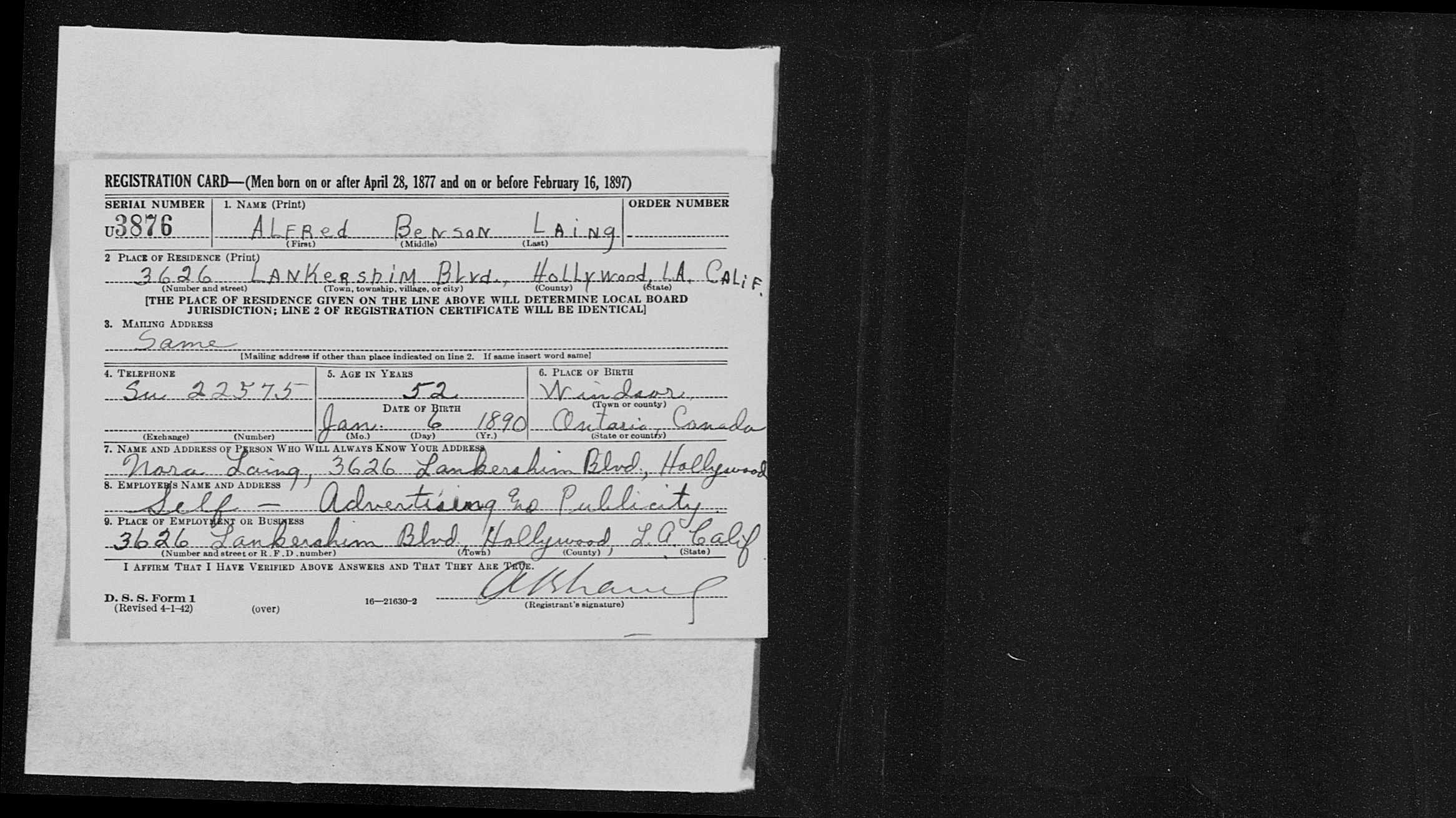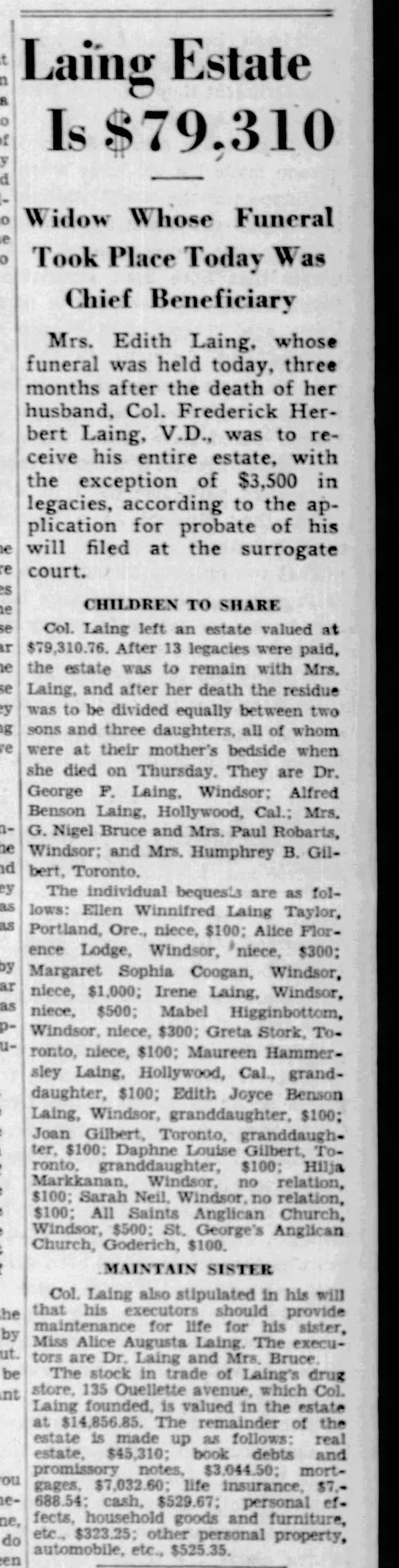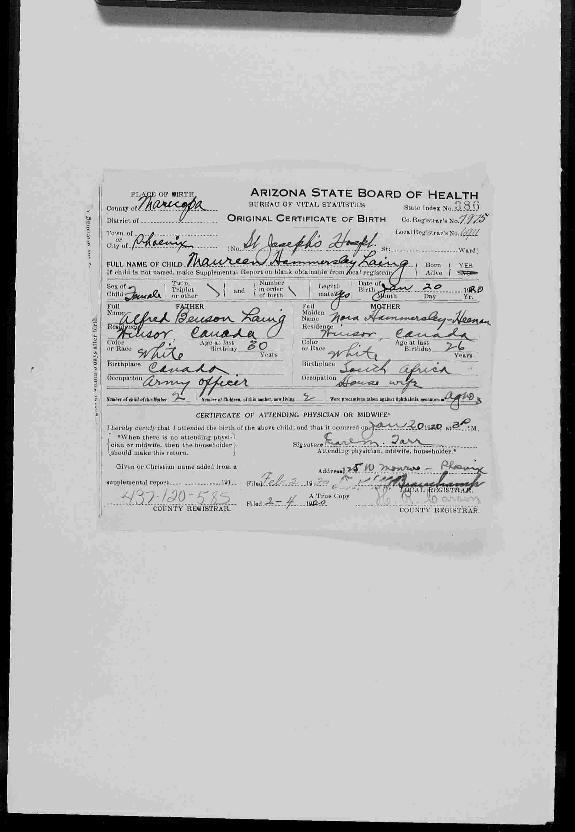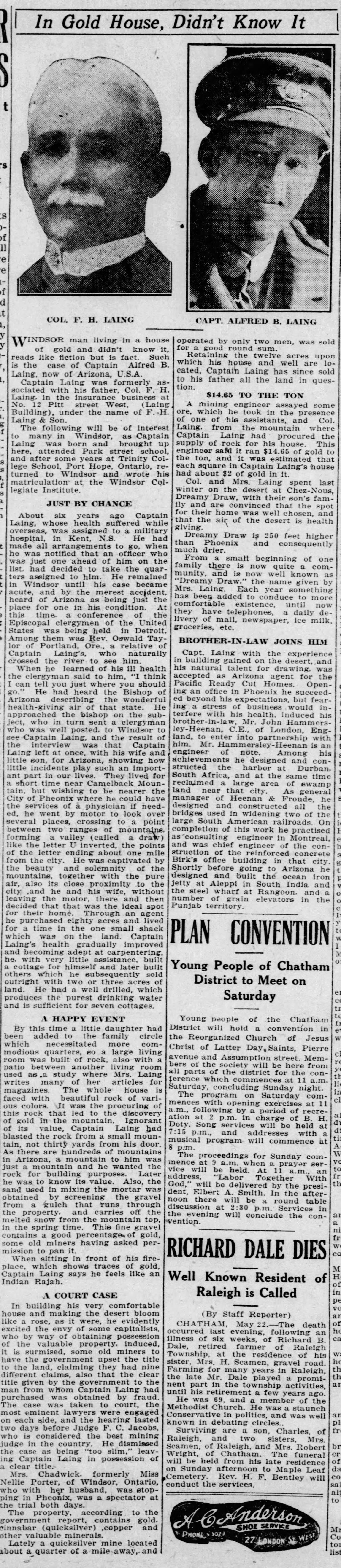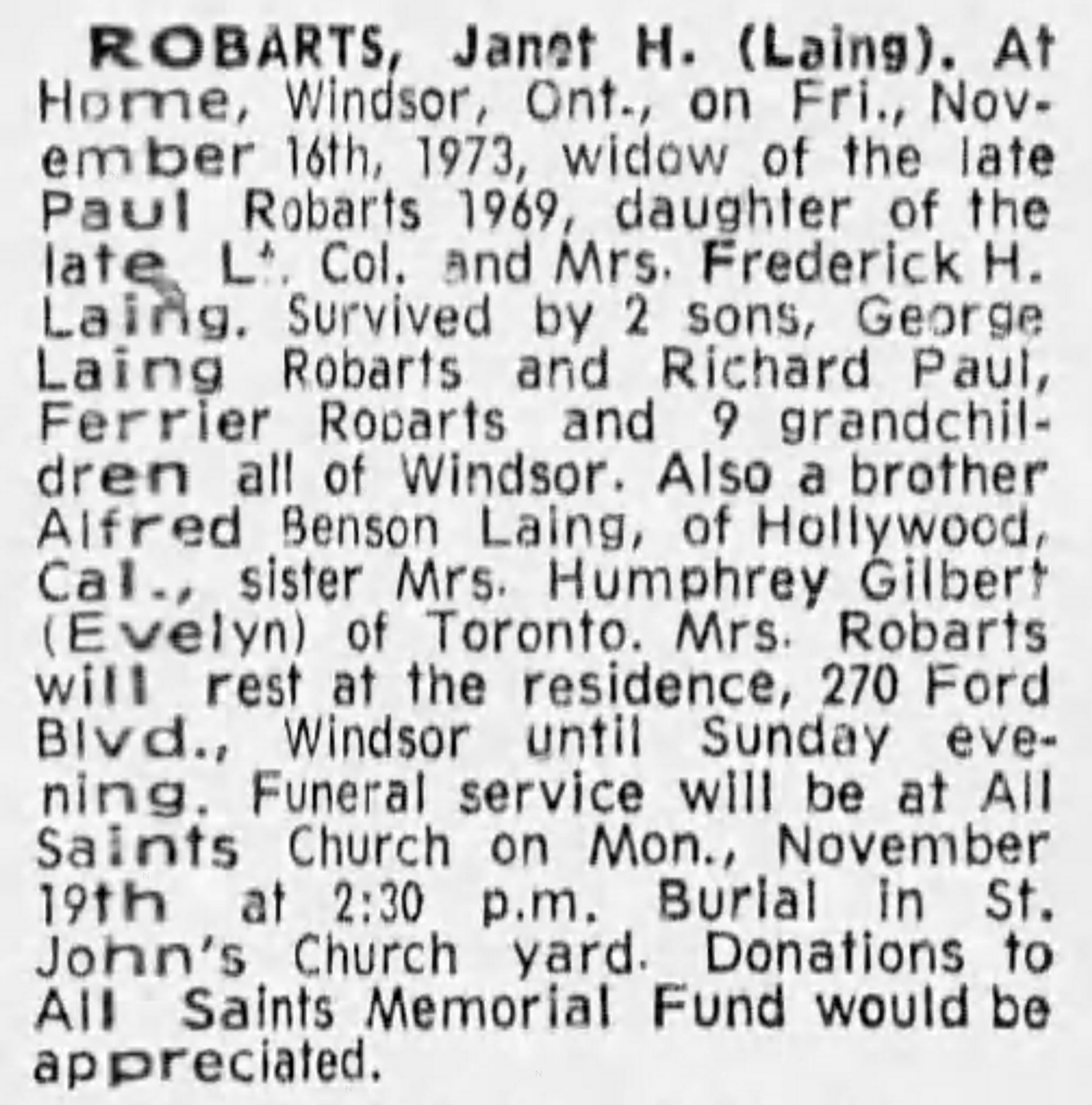 Family Search: When Captain Alfred Benson Laing was born on 6 January 1890, in Windsor, Sandwich, Essex, Ontario, Canada, his father, Colonel Frederick Herbert Laing, was 33 and his mother, Edith Jane Davidson Benson, was 30. He married Nora Hammersley-Heenan on 30 September 1917, in Finchley, Barnet, London, England, United Kingdom. They were the parents of at least 1 son and 1 daughter. He lived in Essex, Essex, Ontario, Canada in 1911 and Phoenix, Maricopa, Arizona, United States in 1924. He died on 27 July 1976, in Los Angeles, Los Angeles, California, United States, at the age of 86, and was buried in Forest Lawn Memorial Park, Hollywood Hills, Los Angeles, Los Angeles, California, United States.