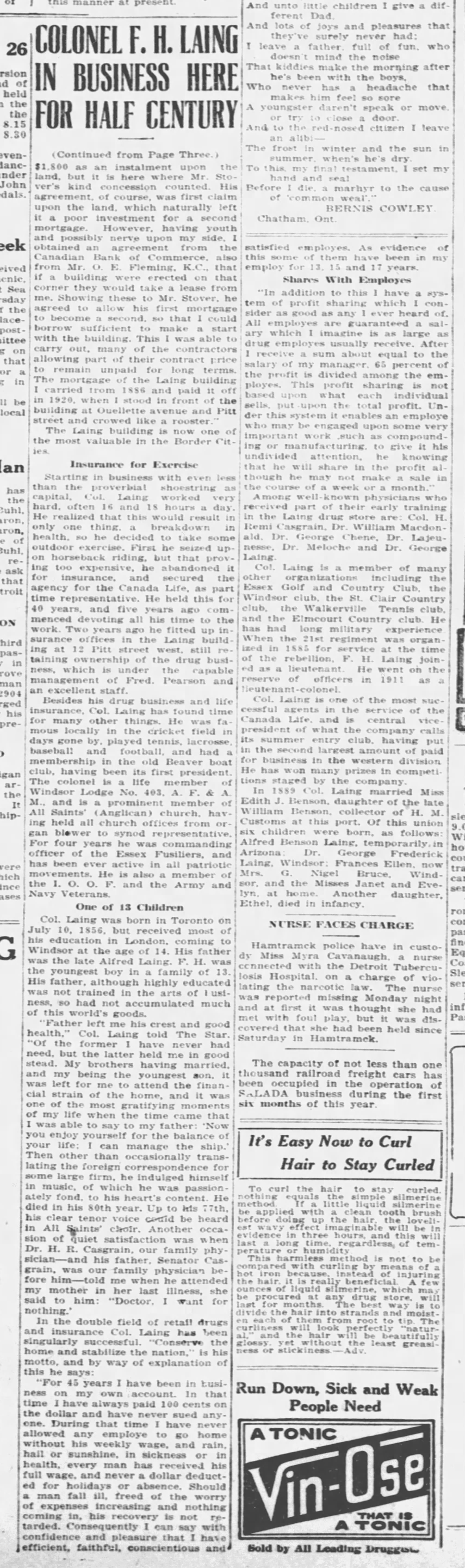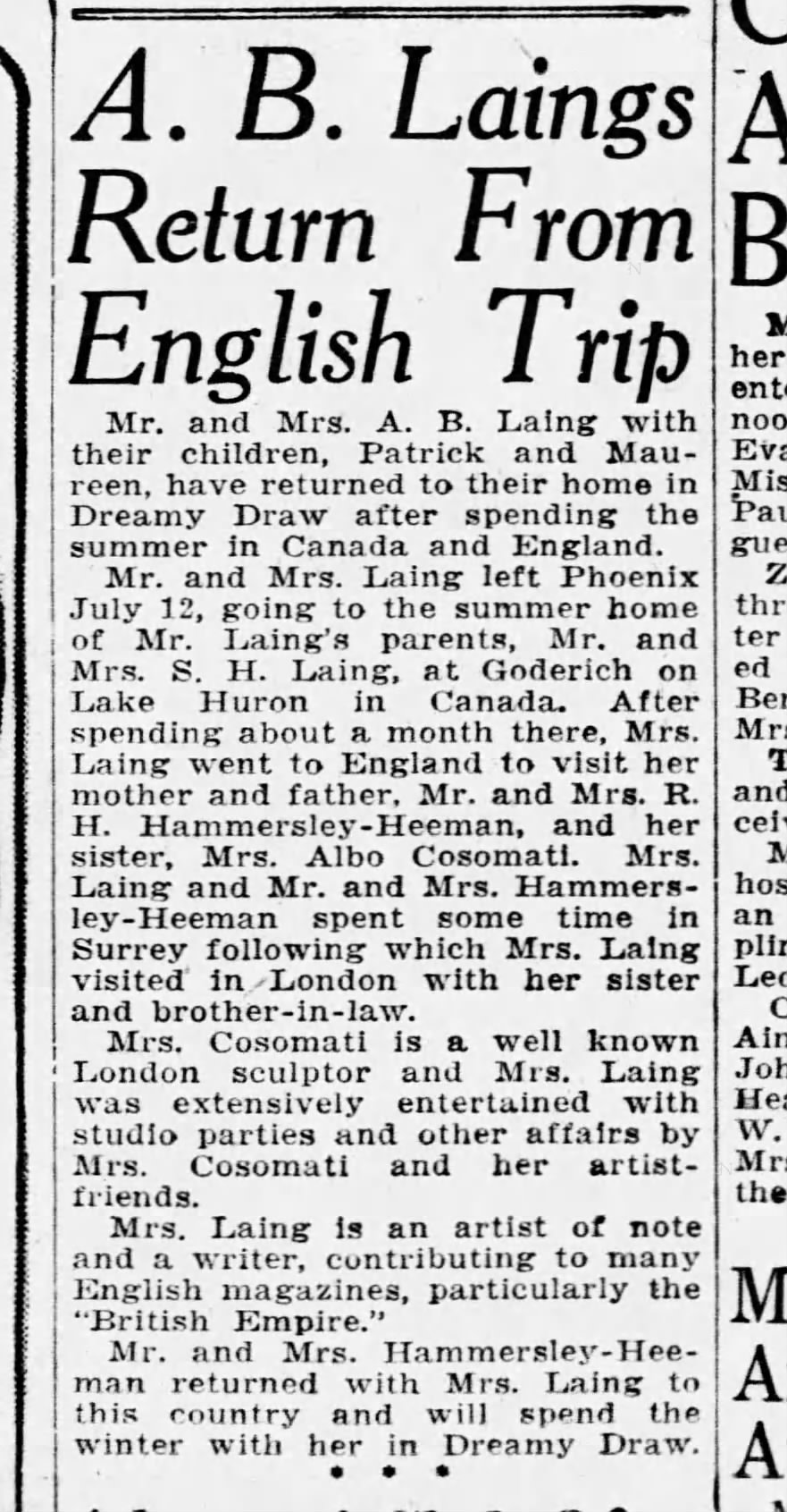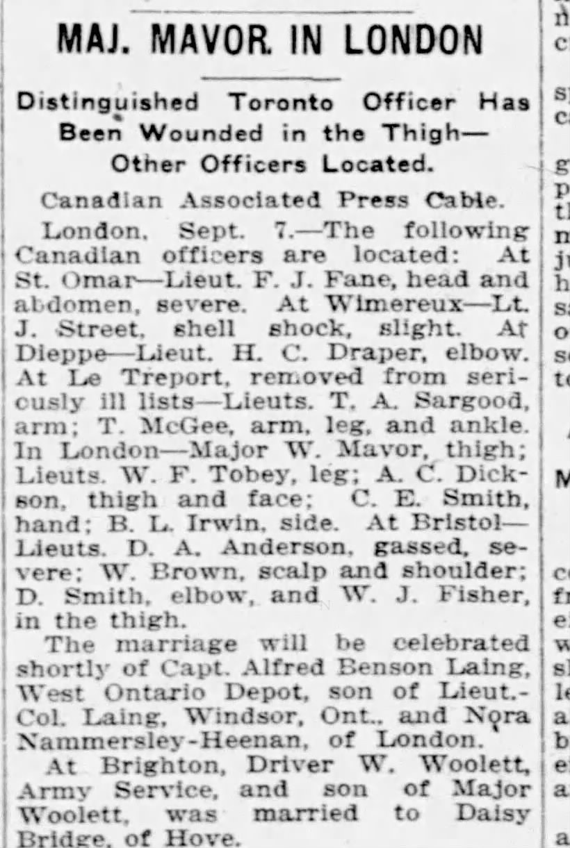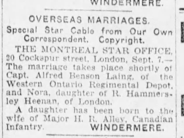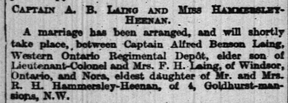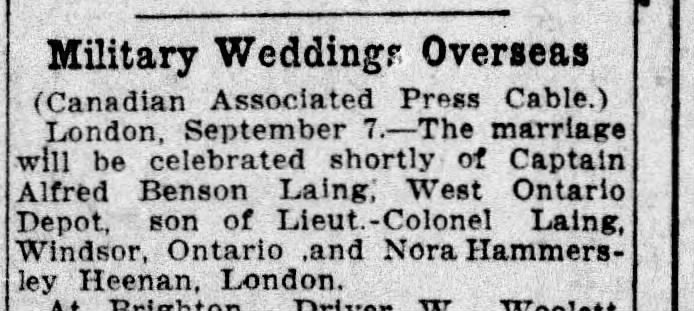 London, Sept. 7.–The marriage will be celebrated shortly of Capt. Fred Benson Laing, of the Western Ontario Depot Unit, son of Lieut.-Col. Laing, Windsor, Ontario, to Miss Nora Hammersley Heenan, London.