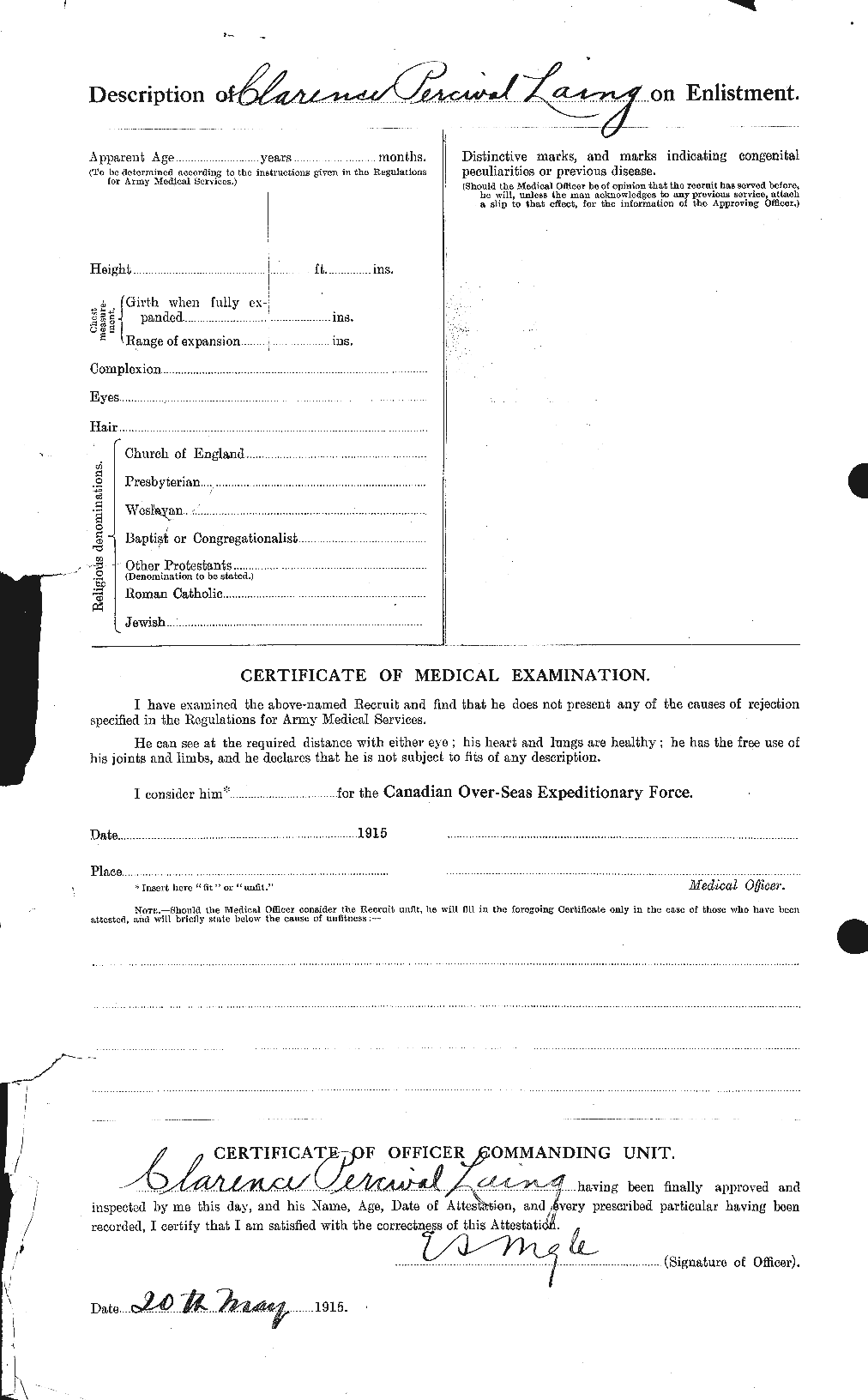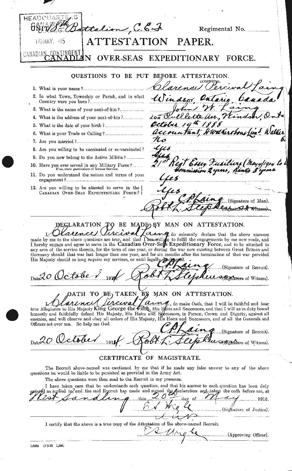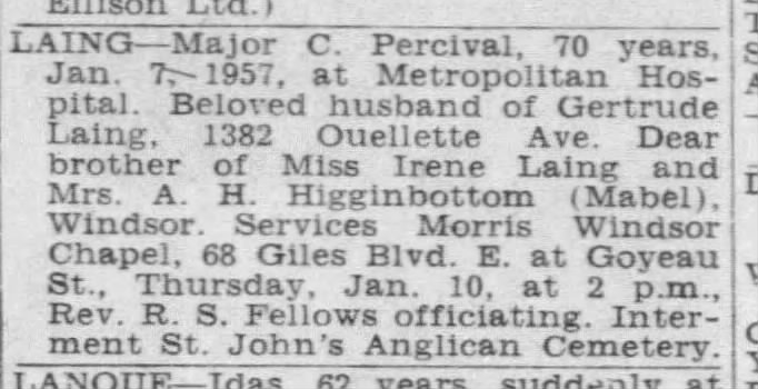 Family Search: Major Clarence Percival Laing was born on 19 October 1888, in Windsor, Sandwich, Essex, Ontario, Canada as the son of John Wilfred Laing and Harriet M. Shipley. In 1939, his occupation is listed as accounting department, hiram walker in Walkerville, Windsor, Essex, Ontario, Canada. He died on 7 January 1957, in Windsor, Essex, Ontario, Canada, at the age of 68, and was buried in Windsor, Essex, Ontario, Canada.