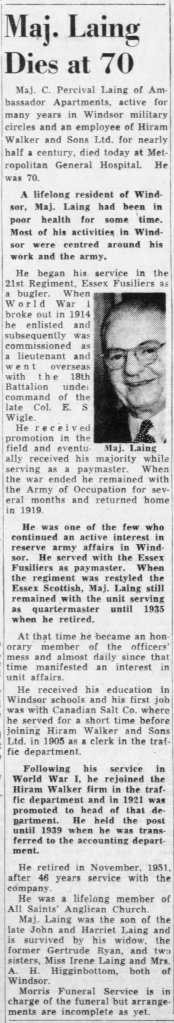 A lifelong resident of Windsor, Maj. Laing had been in poor health for some time. Most of his activities in Windsor were centred around his work and the army.