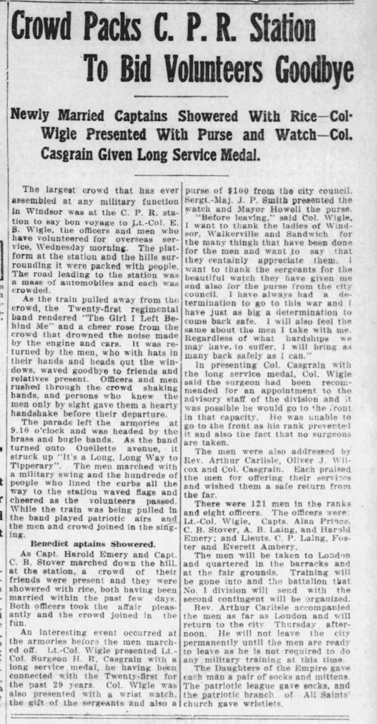 He began his service in the 21st Regiment, Essex Fusiliers as a bugler. When World War I broke out in 1914 he enlisted and subsequently was commissioned as a lieutenant and went overseas with the 18th Battalion under command of the late Col. E. S. Wigle.