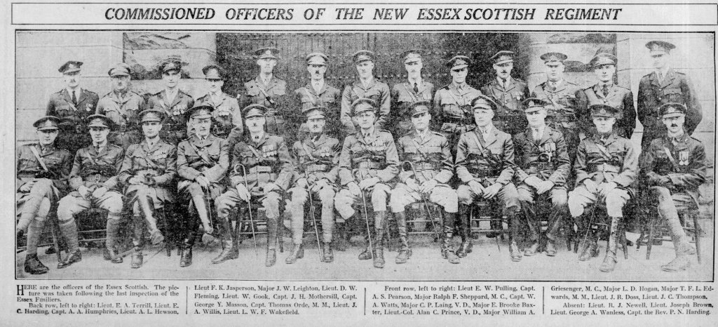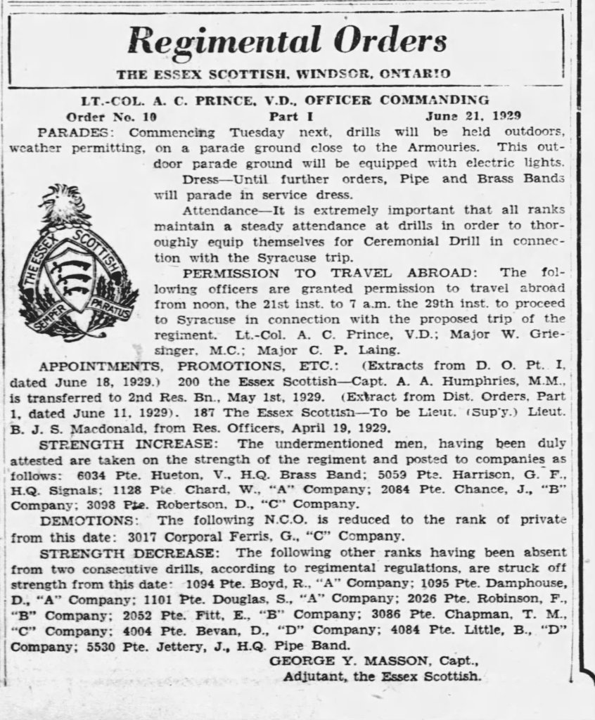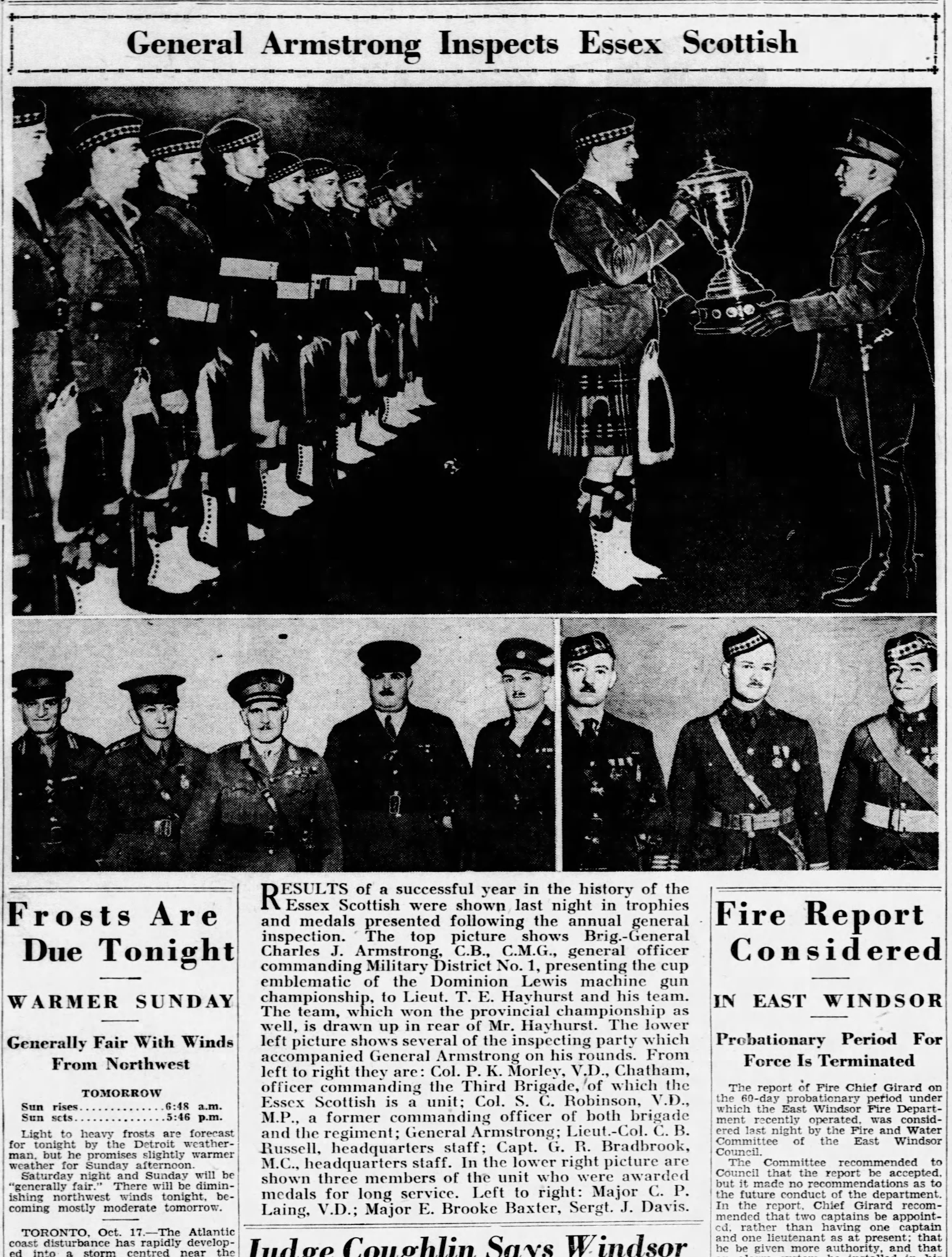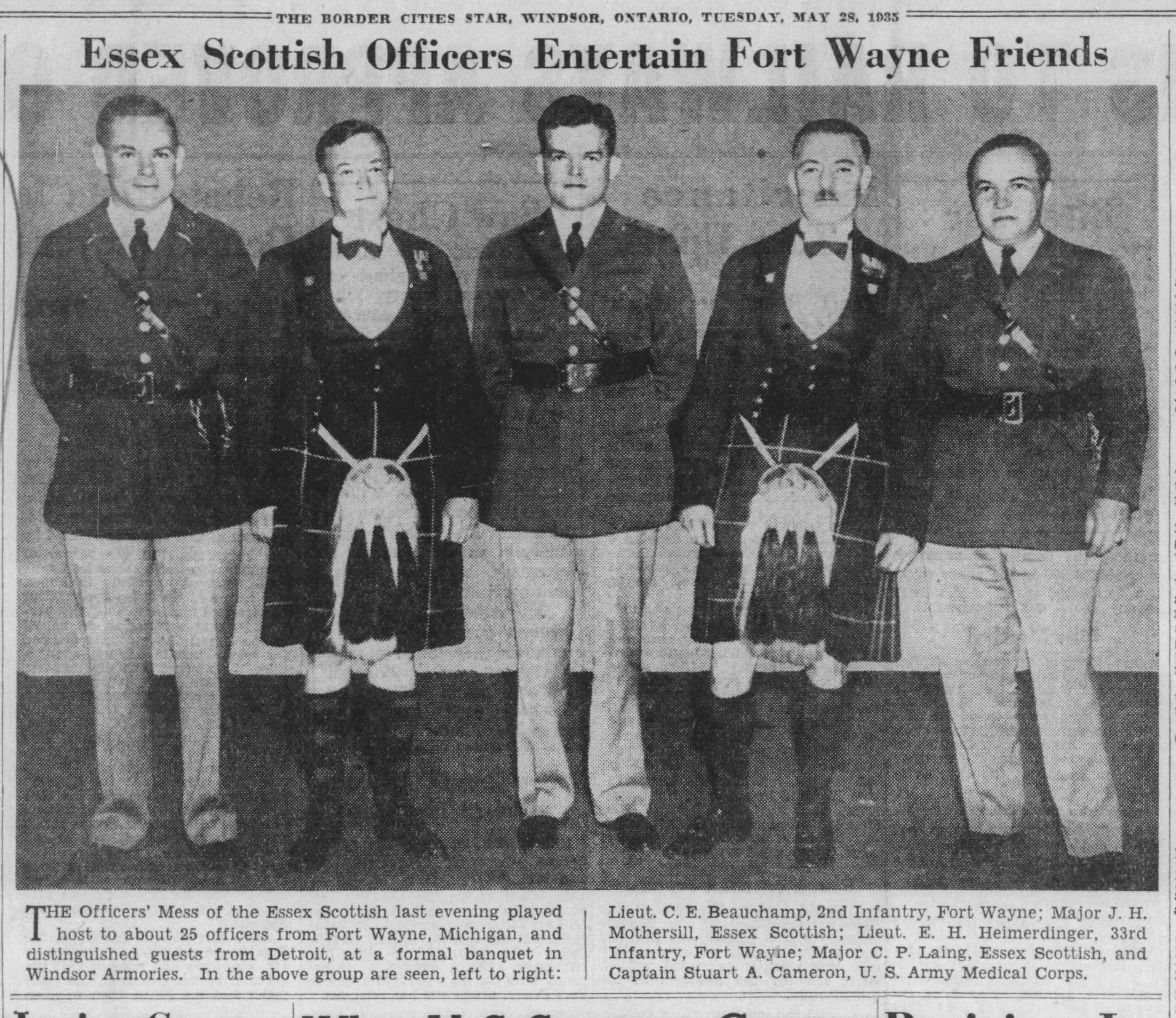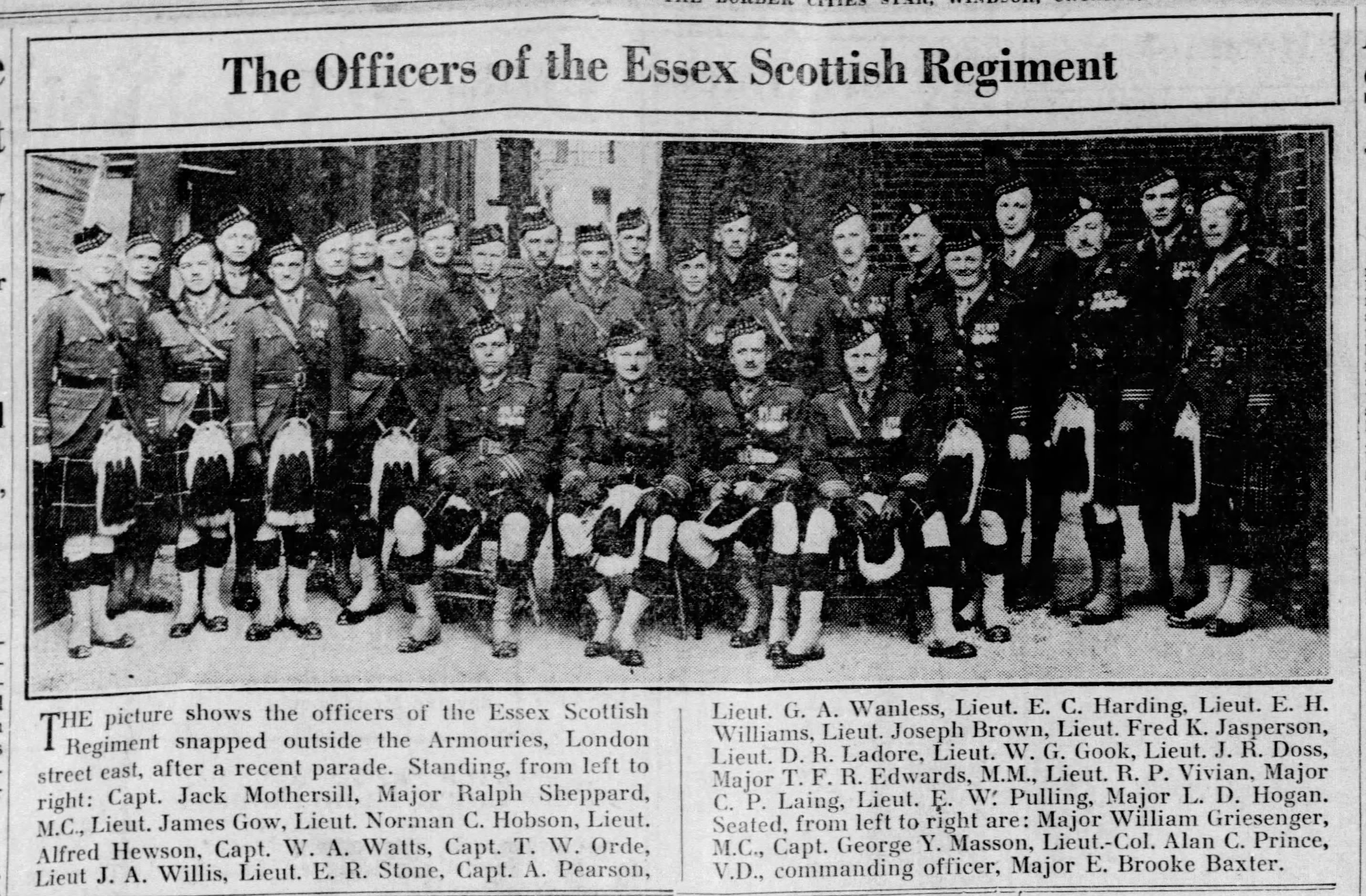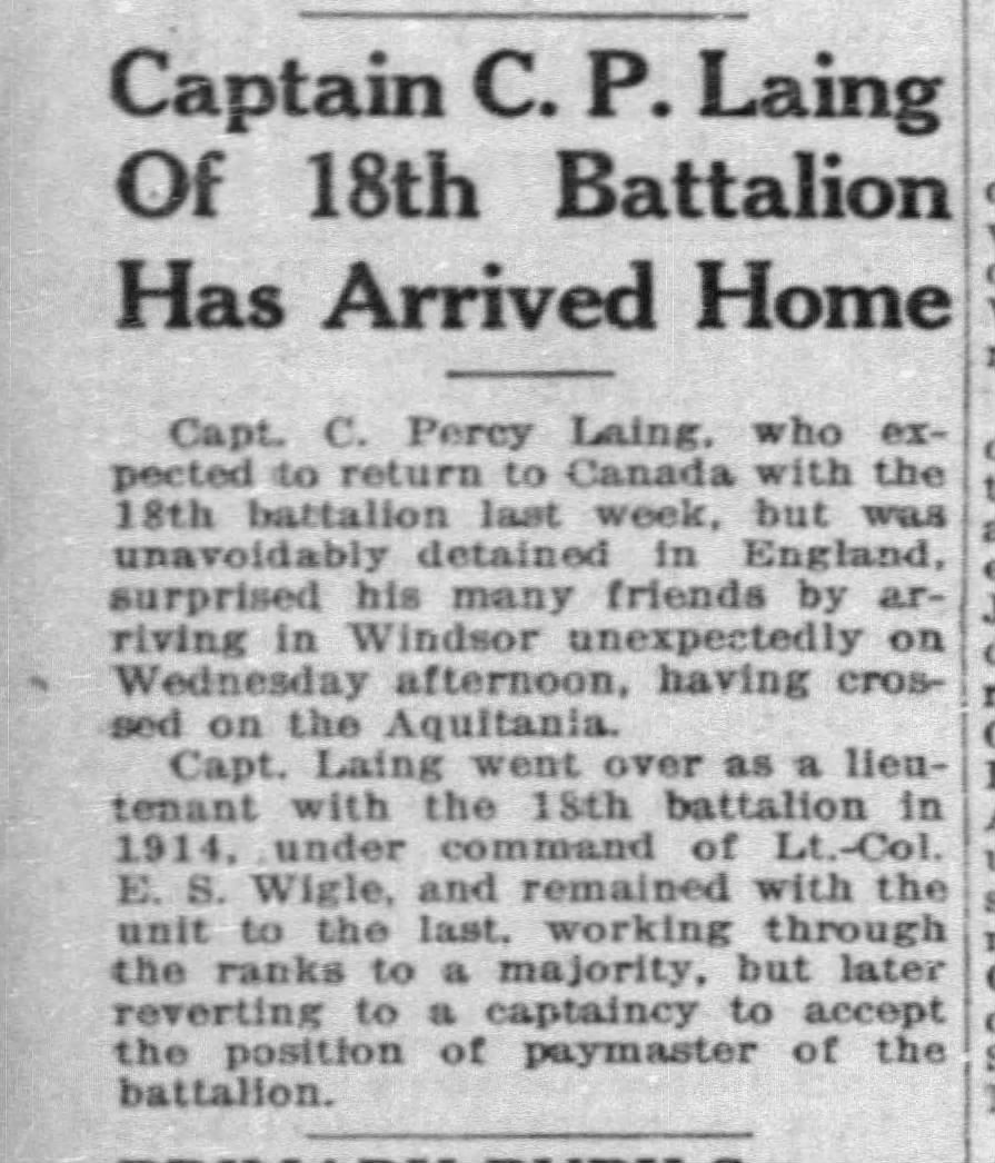 He was one of the few who continued an active interest in reserve army affairs in Windsor. He served with the Essex Fusiliers as paymaster. When the regiment was restyled the Essex Scottish, Maj. Laing still remained with the unit serving as quartermaster until 1935 when he retired.