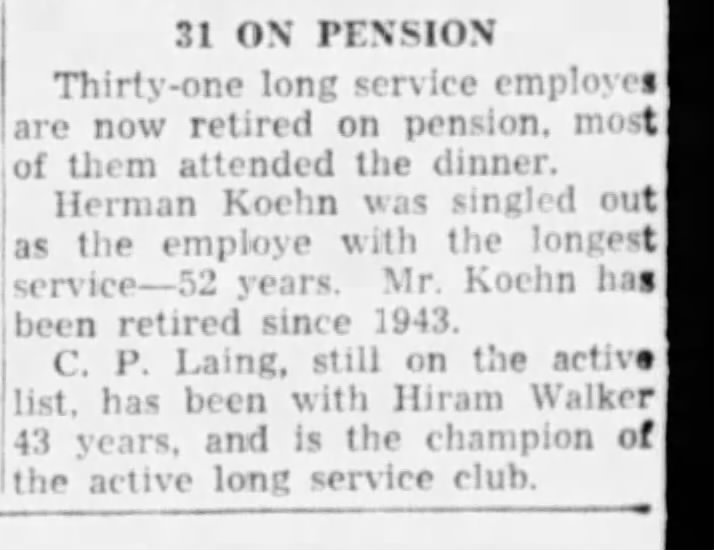 Following his service in World War I, he rejoined the Hiram Walker firm in the traffic department and in 1921 was promoted to head of that department. He held the post until 1939 when he was transferred to the accounting department.